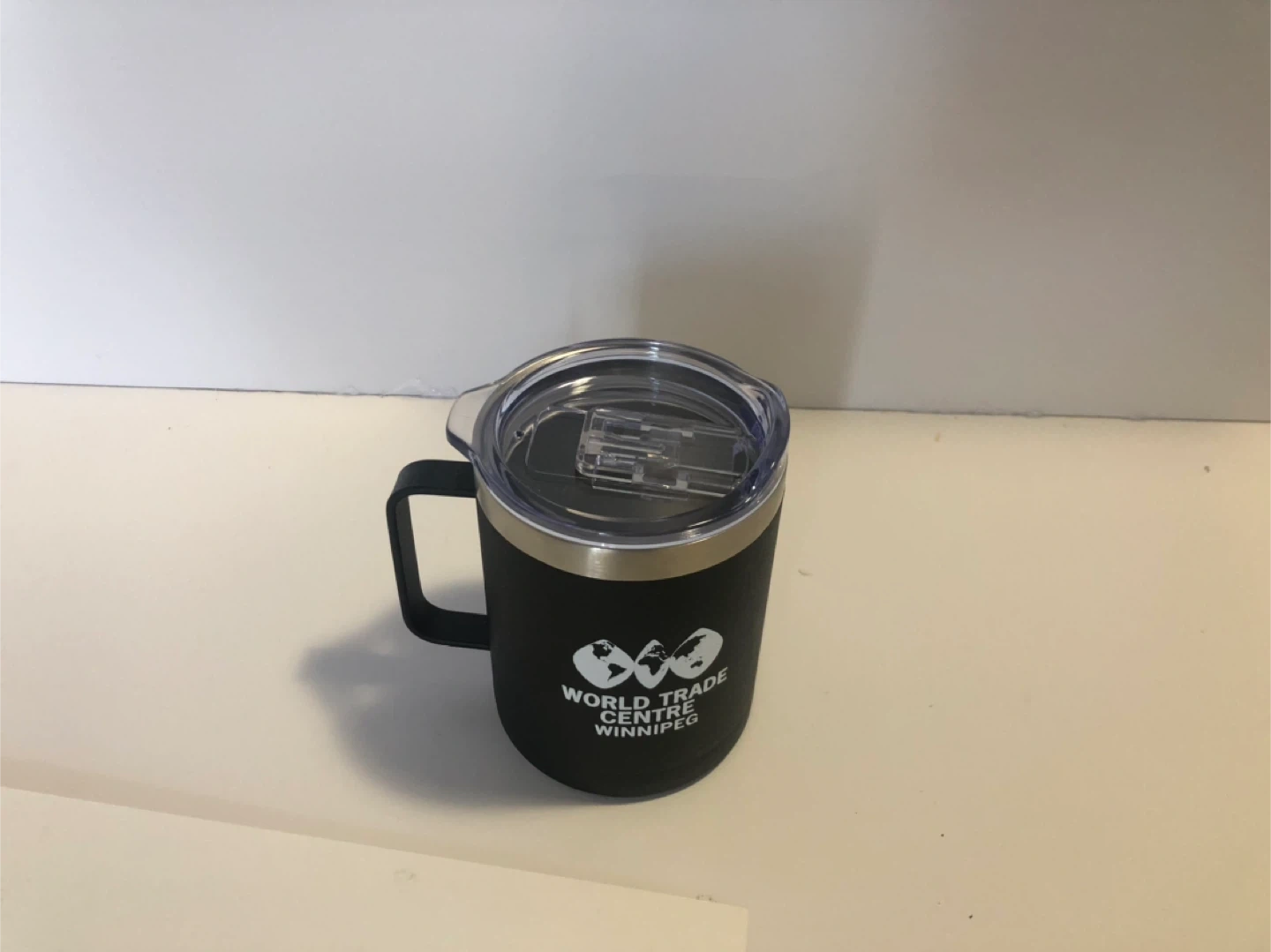 Black insulated travel mug with a handle. It has a secure-fitting lid. Keeps drinks hot or cold for hours. Perfect for your commute or office desk!