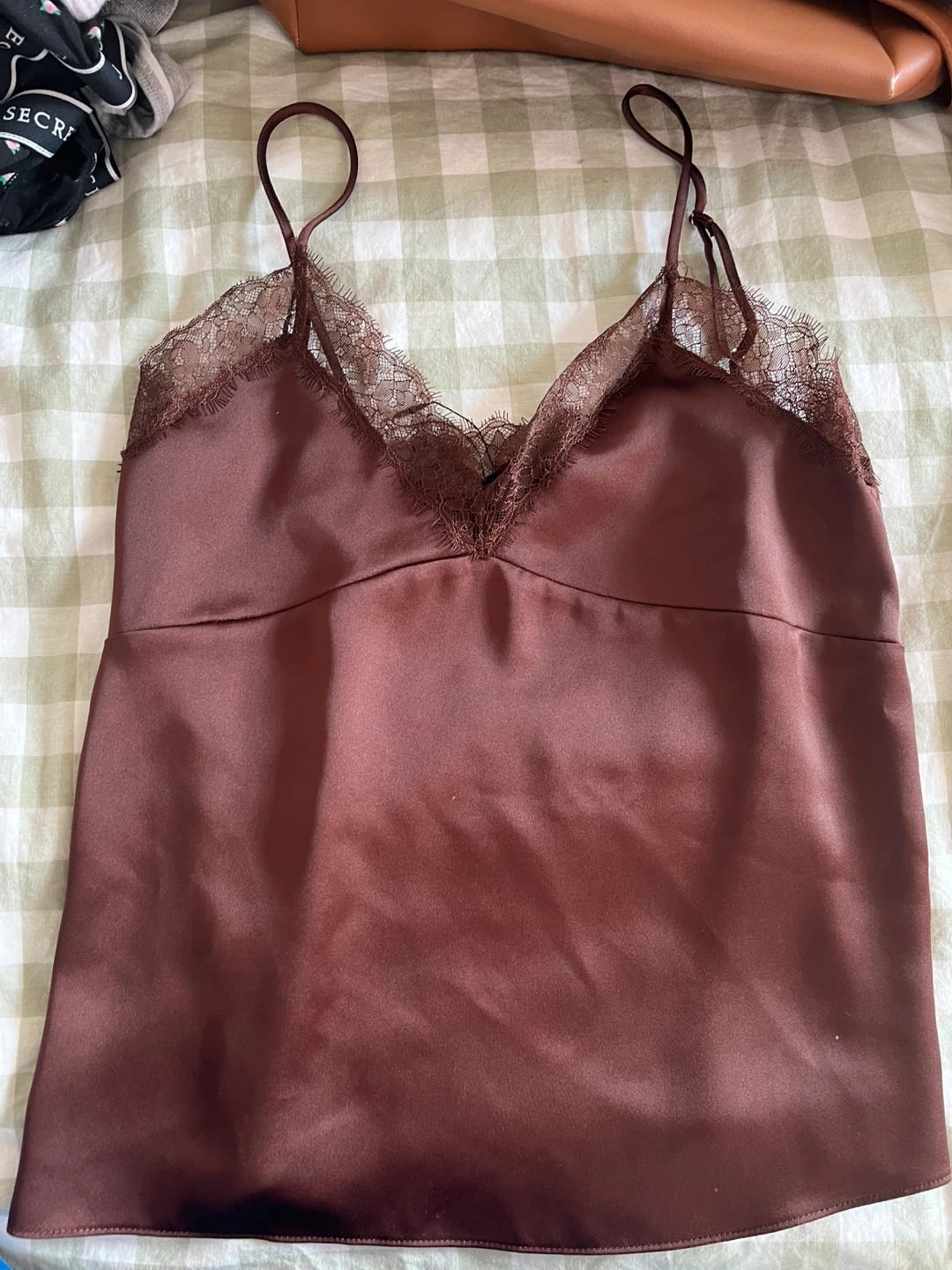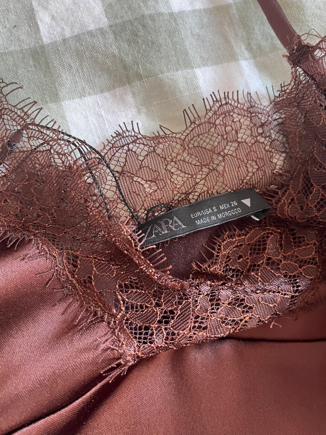 This is a brown Zara cami top with lace trim. It's made of satin material. Size S. Made in Morocco.