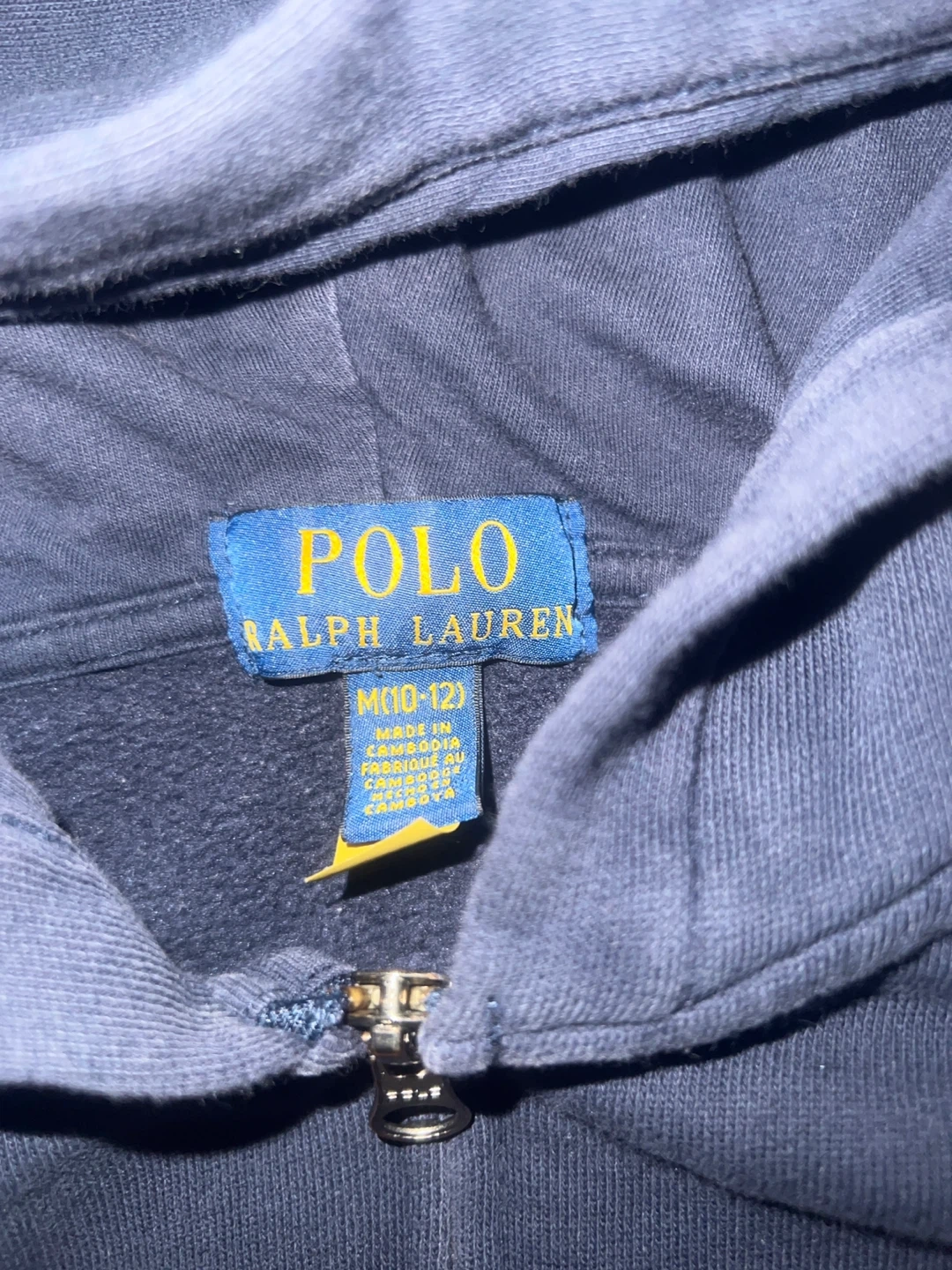 Navy blue Polo Ralph Lauren zip-up hoodie. Youth size medium, fits 10-12. Made in Cambodia. Cotton blend material.