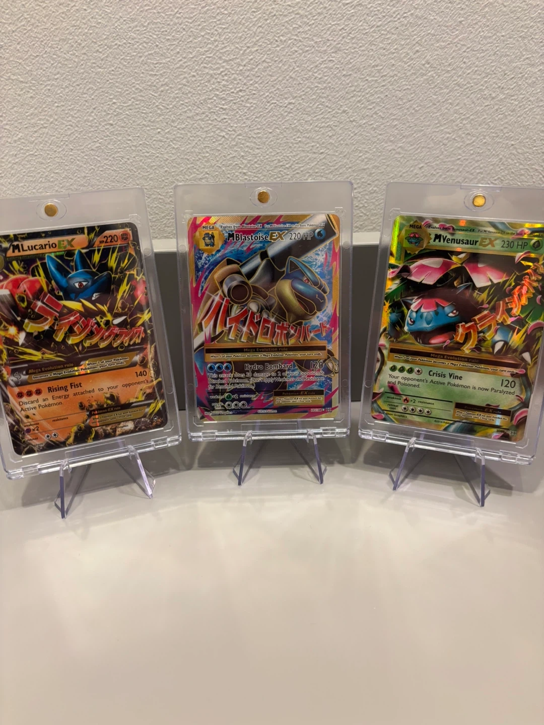Conditions aren’t mint but all 3 fronts display flawlessly. Backs are lightly played for both Blastoise and Venusaur, and heavily played for the older Lucario.