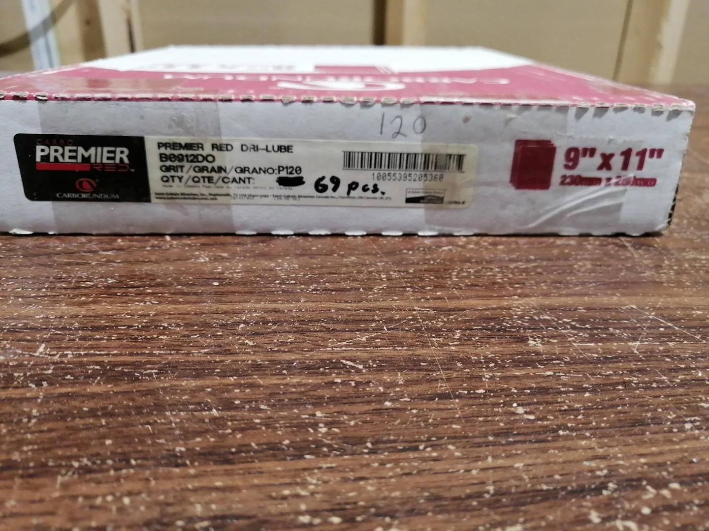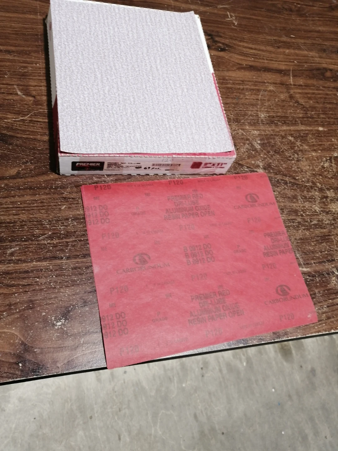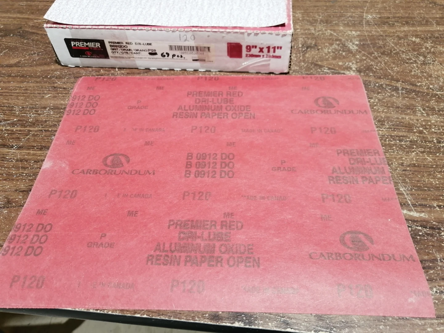 Premier Red Dri-Lube aluminum oxide resin paper. Open coat. 9" x 11" sheets. 120 grit. Includes 69 pieces. Made in Canada. Call Anthony