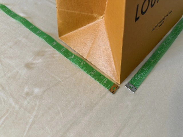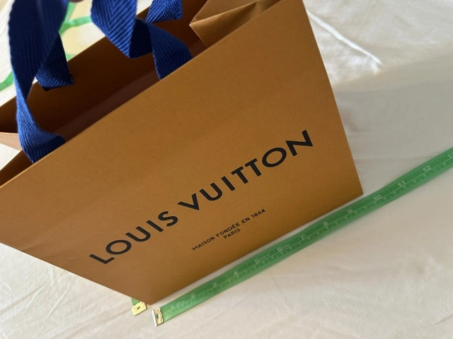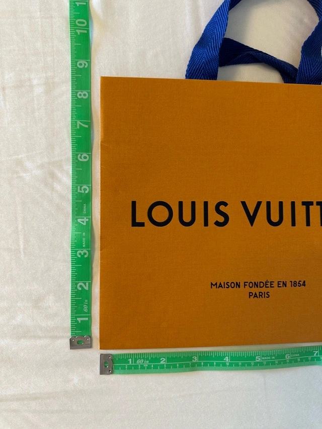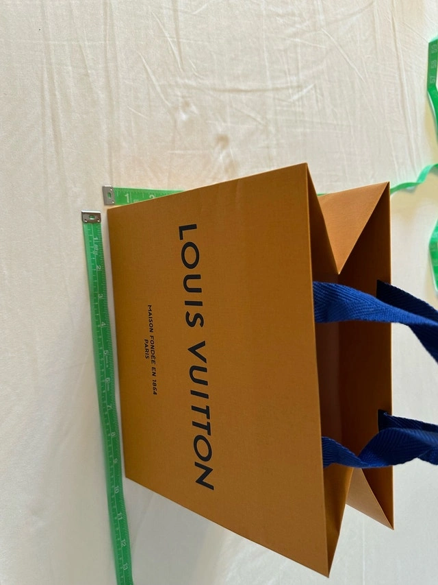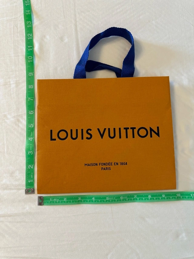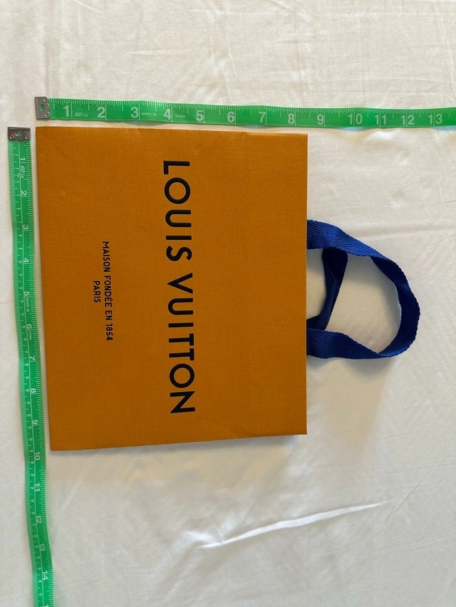 This is a small Louis Vuitton paper bag with blue handles, perfect for small gifts or organizing your smaller items. This bag measures approximately 7 inches in height, 12.75 inches in length, and 4.75 inches in width. It is in good condition. A similar bag sells for about $50-75 on Kijiji. I'm asking $50. Brand: Louis Vuitton. Colour: Brown. Handles: Blue. Ideal as a movie prop, great item for home staging, or a wonderful addition to your shopping bag collection. We live near Highway 404 and Highway 407. If the ad's still up, the bag's still here, ready to add a dash of high-fashion flair to your day! Cash accepted.