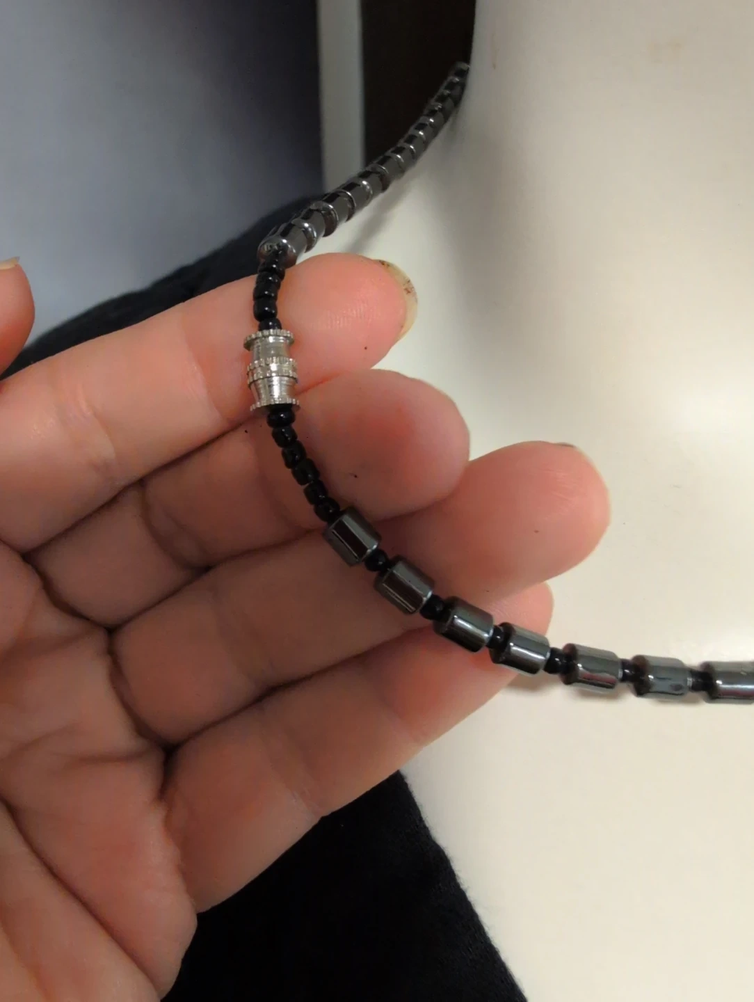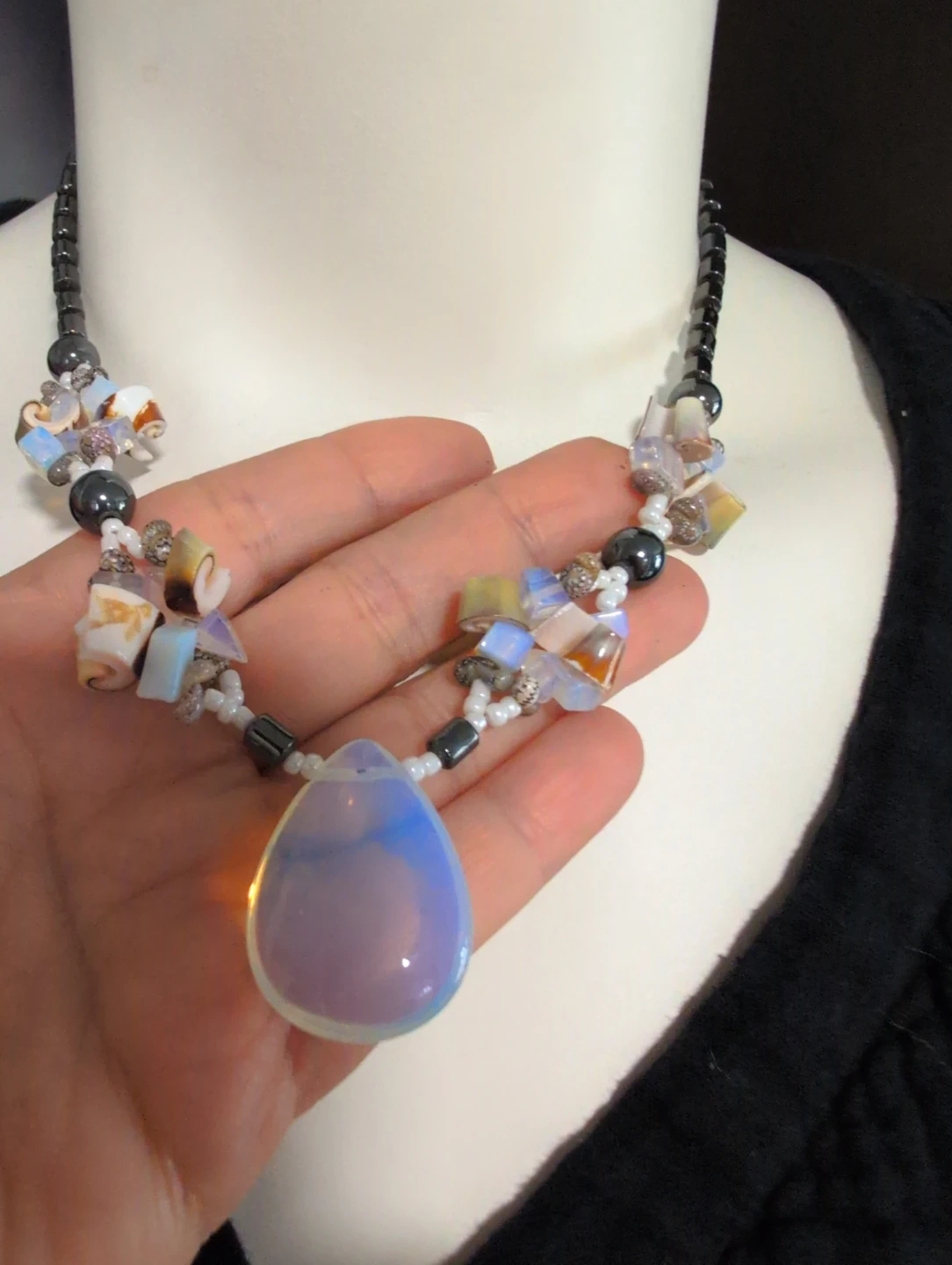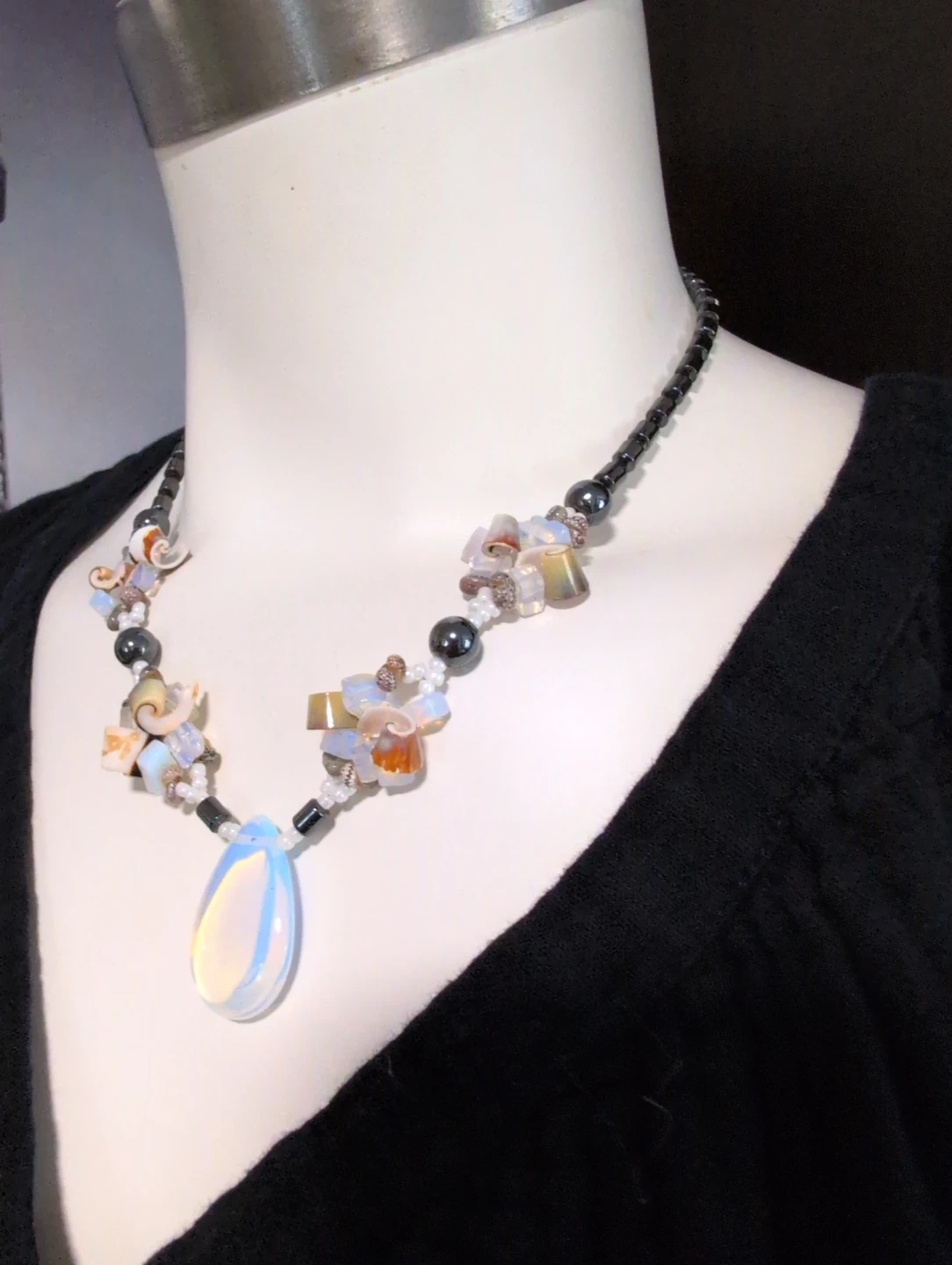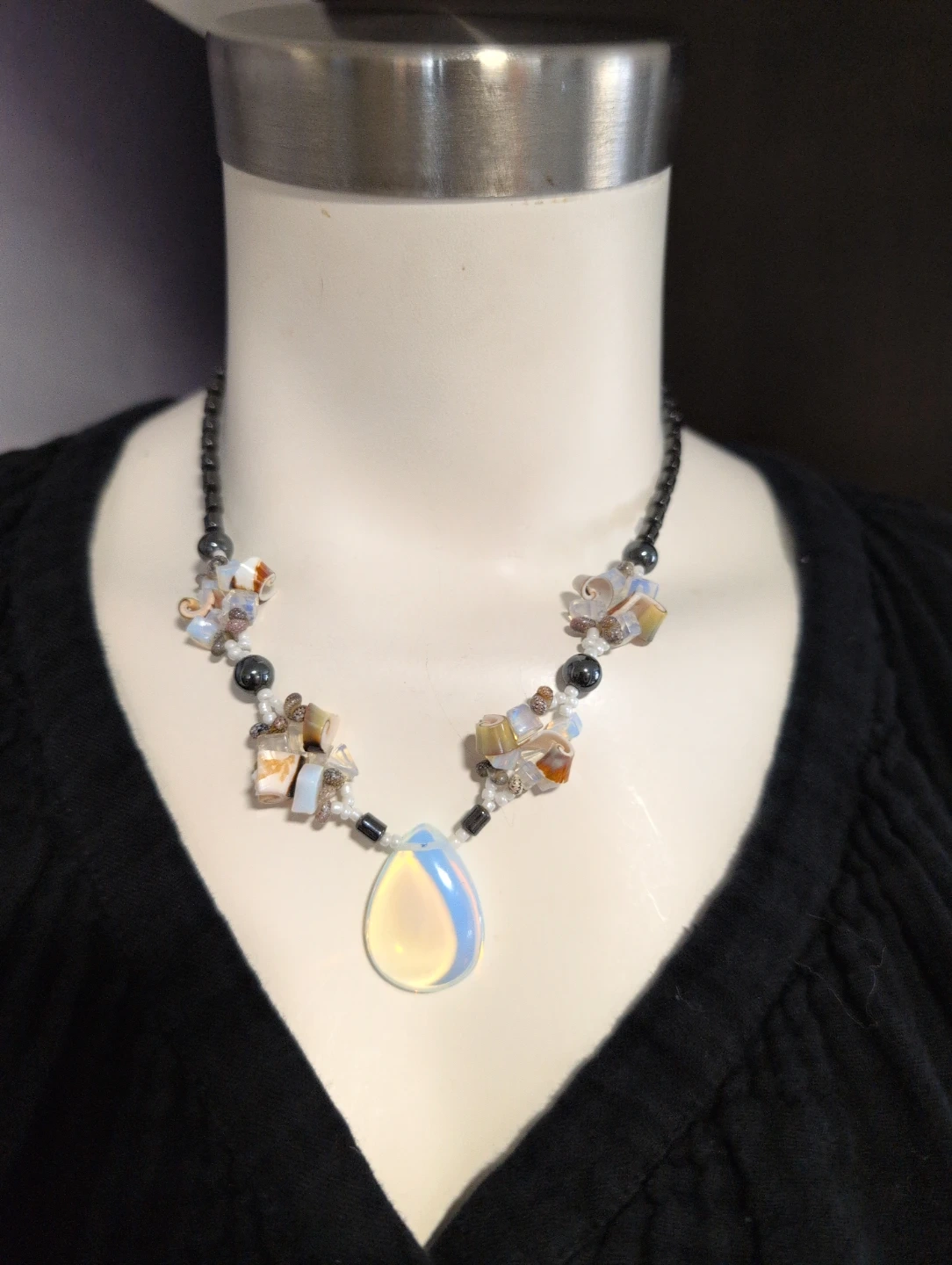 This unique necklace features a strand of small black beads interspersed with rectangular hematite-toned beads. A pear-shaped pendant with an opalescent finish hangs from the centre, complemented by clusters of multi-coloured beads. It's a stylish accessory for any occasion!