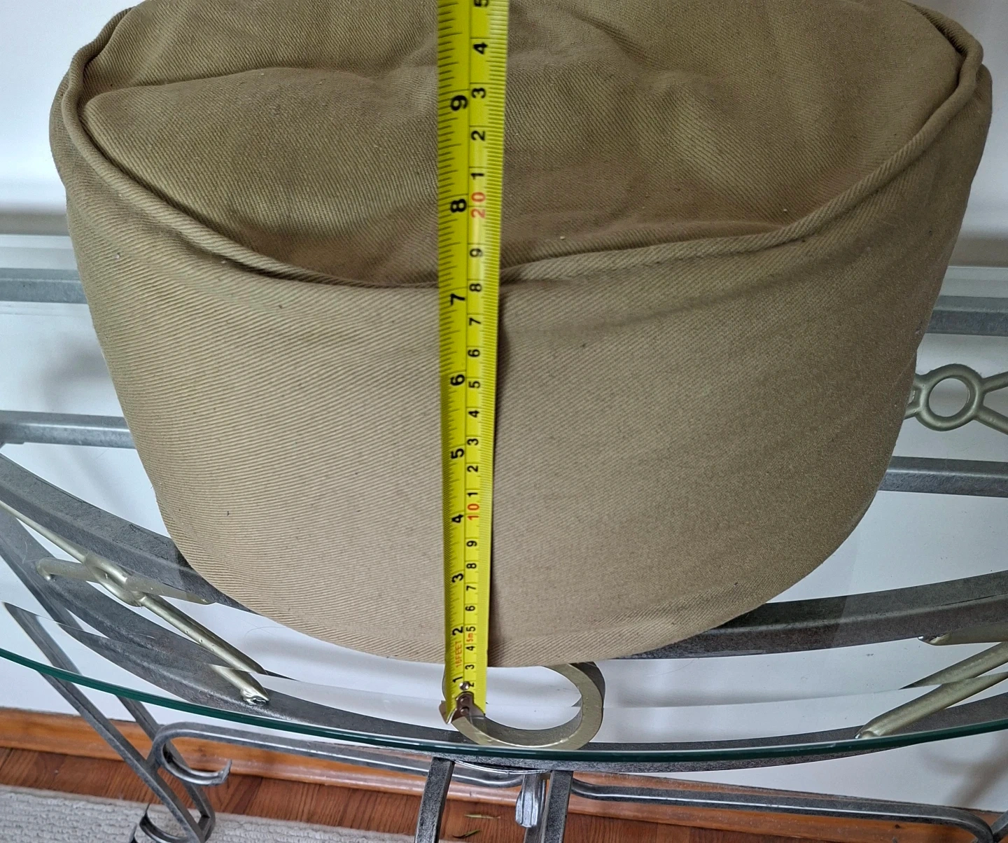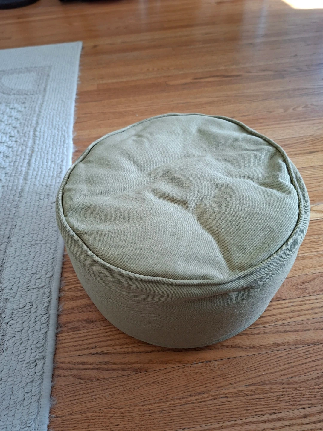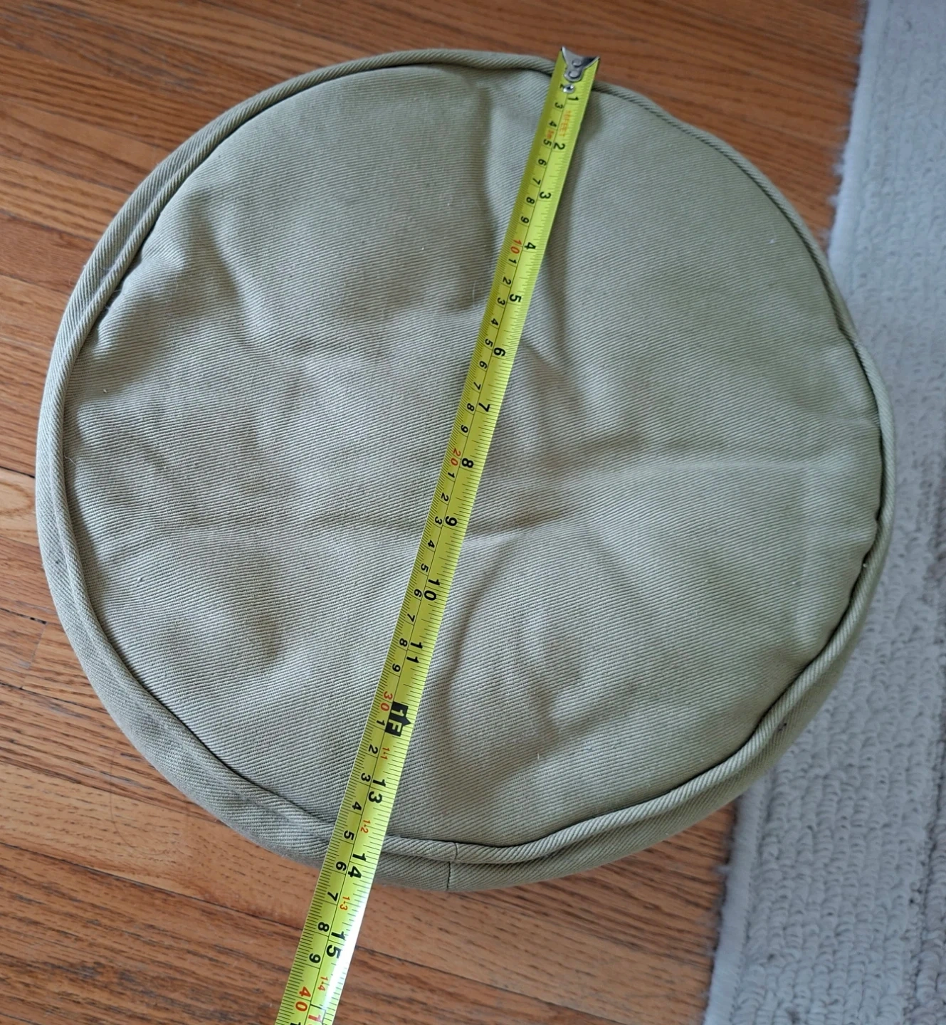 This is a round, padded cushion. It measures approximately 7 inches in height and 14 inches in diameter. The cover is made of durable tan fabric. It's sturdy enough for use as a small ottoman!