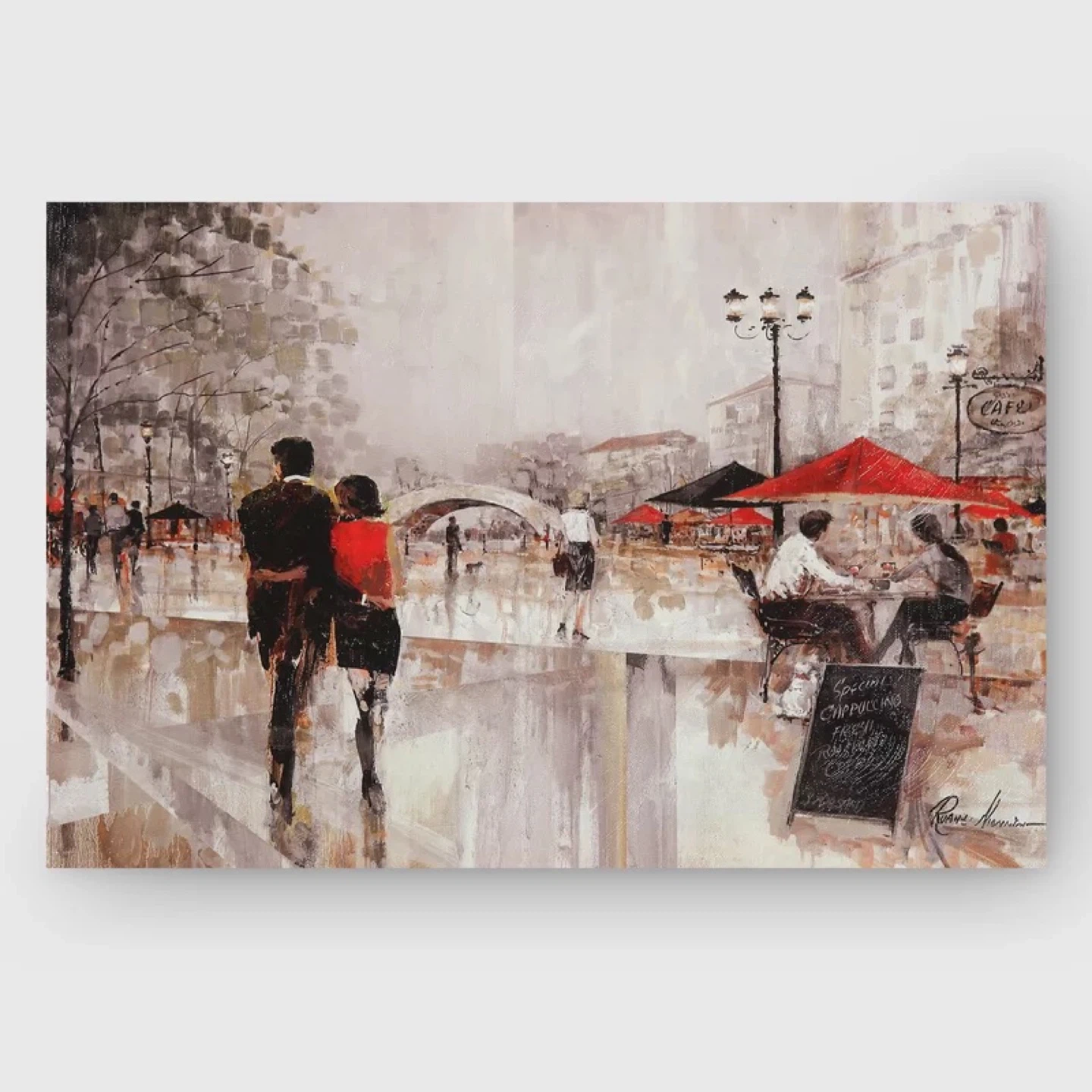 This is a painting depicting a romantic Parisian cafe scene. It features a couple walking in the rain with umbrellas and outdoor seating at the cafe. The artwork is signed by Pierre Rousseau.
