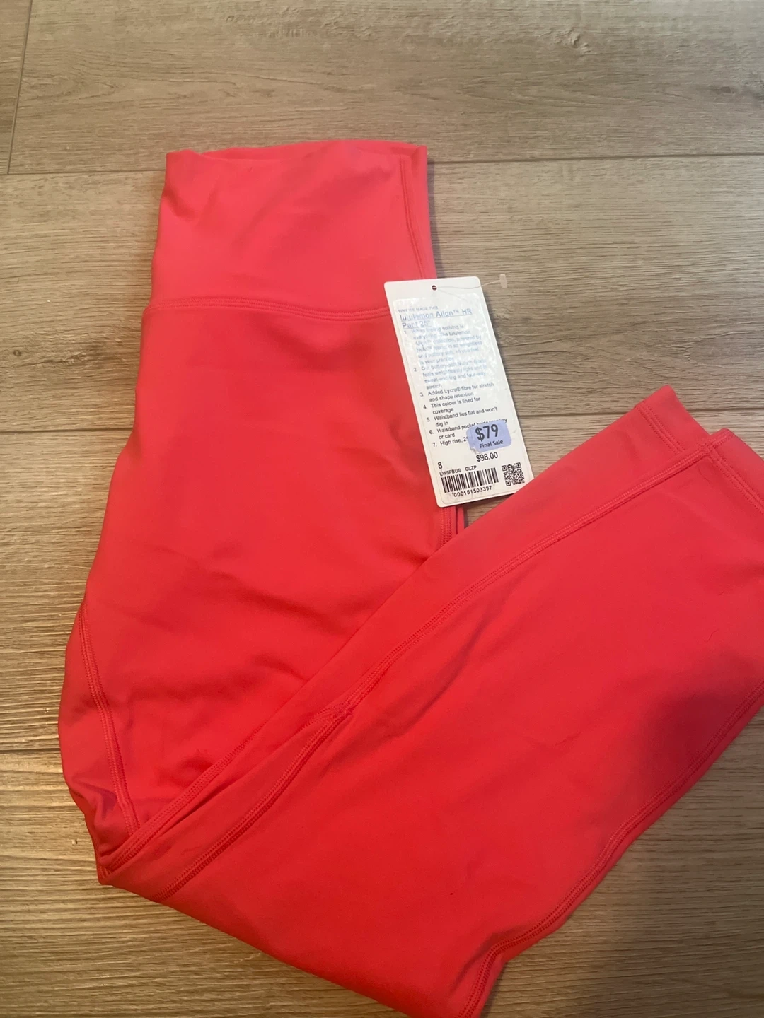 Lululemon Align HR leggings in a bright coral colour. Made with added Lycra fibre for stretch and shape retention. Waistband lies flat and won't dig in, with a hidden waistband pocket. These leggings are perfect for everyday wear and light activities.
