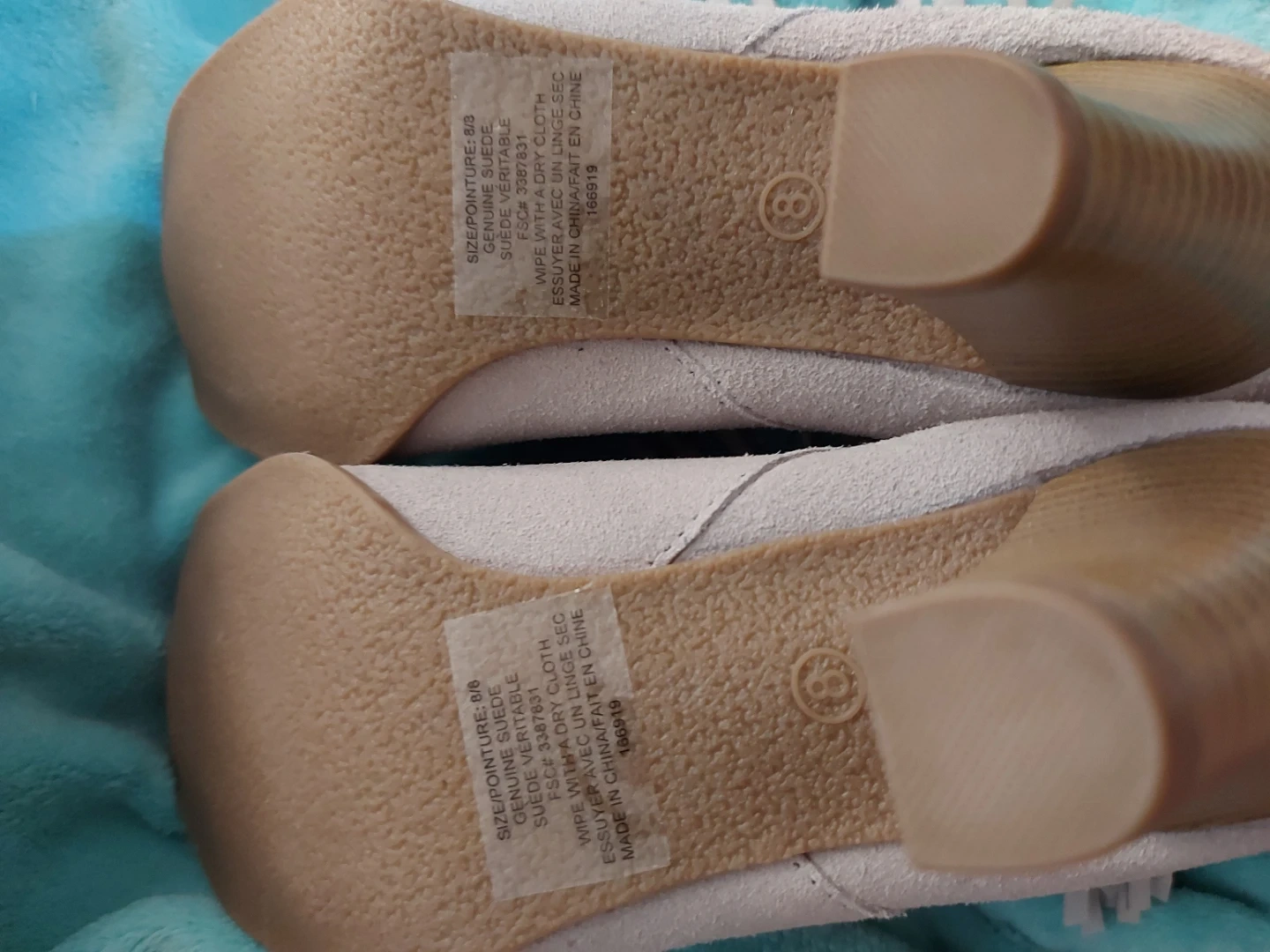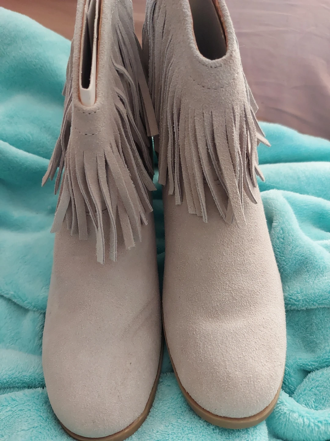 Tan faux suede ankle boots with fringe detailing. Back zippers for easy on and off. Genuine suede construction. Wipe clean with a dry cloth.I have never worn these. I believe a 7.5-8 fit. I welcome tryons with socks.