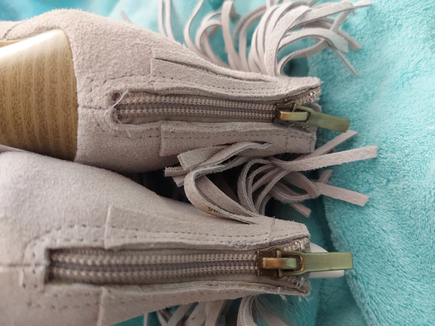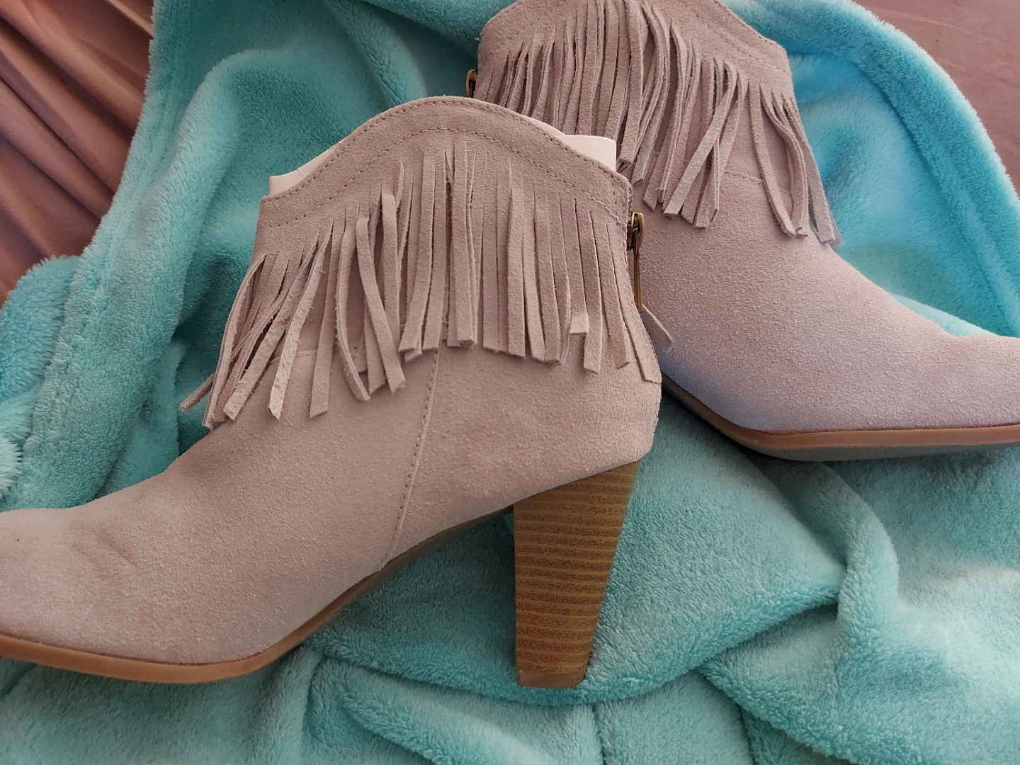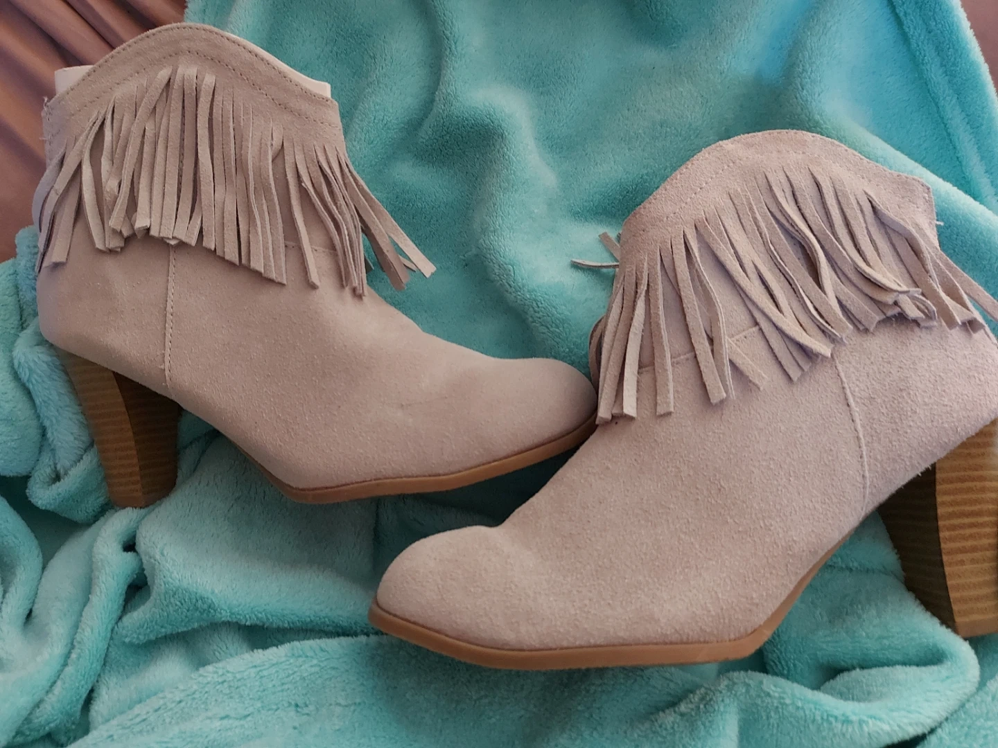 Tan faux suede ankle boots with fringe detailing. Back zippers for easy on and off. Genuine suede construction. Wipe clean with a dry cloth.I have never worn these. I believe a 7.5-8 fit. I welcome tryons with socks.