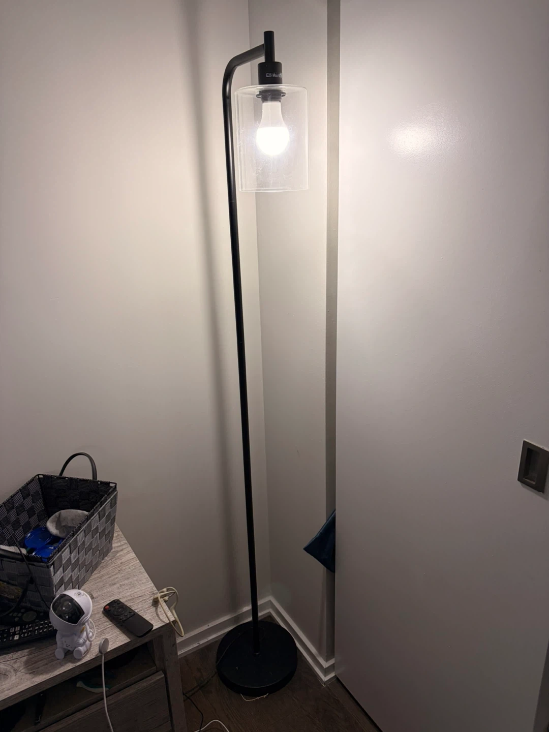 A sleek black floor lamp with a clear glass cylindrical shade. It's designed for a standard E26 bulb, providing ample lighting. This lamp's simple design fits well in various room decors. It is smart and has its own app to control.