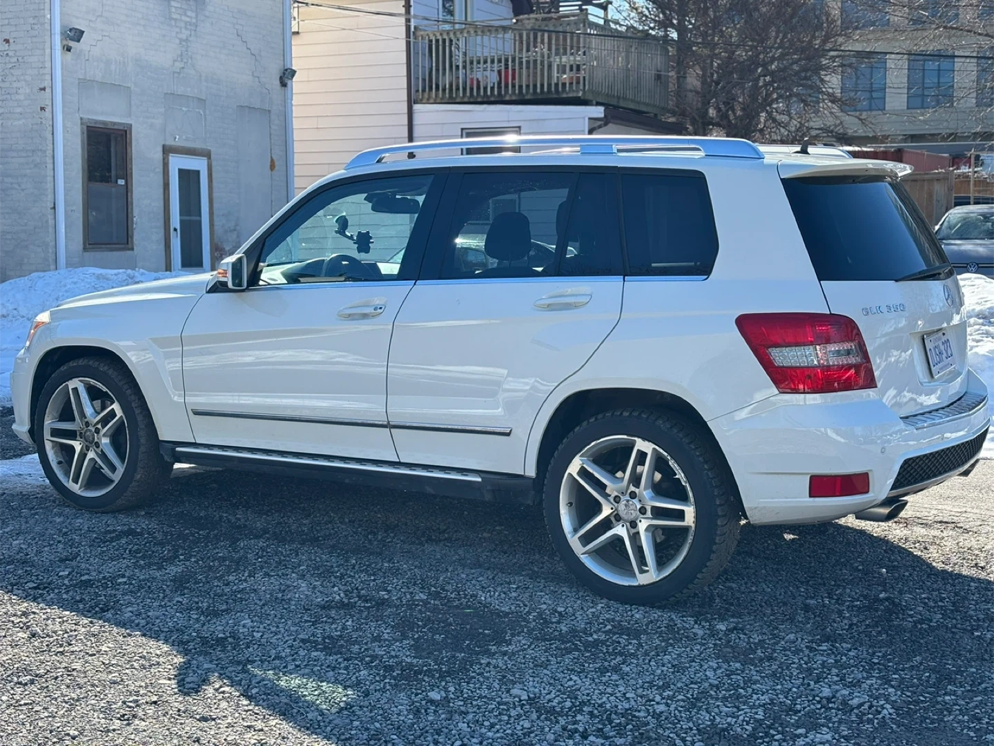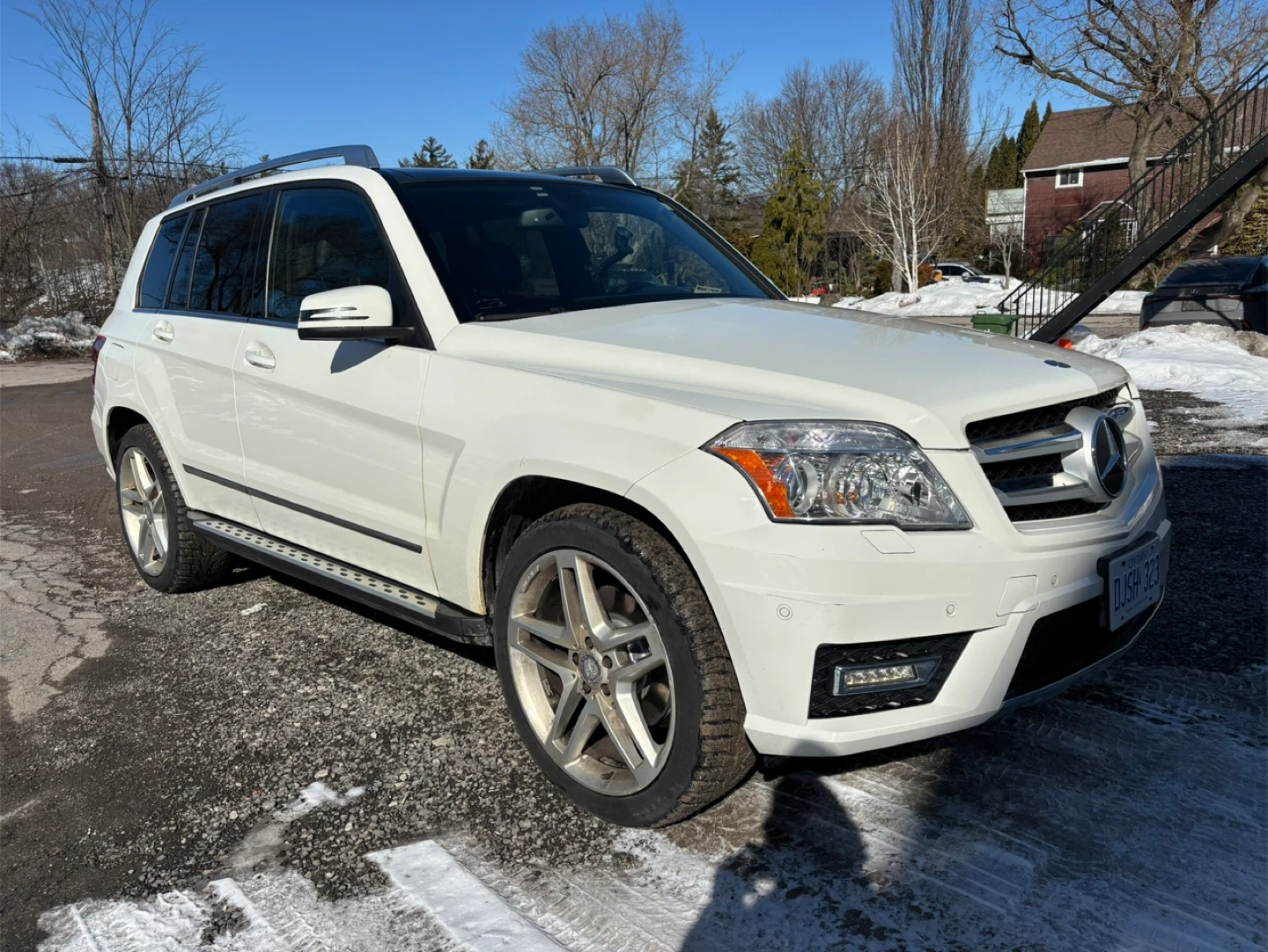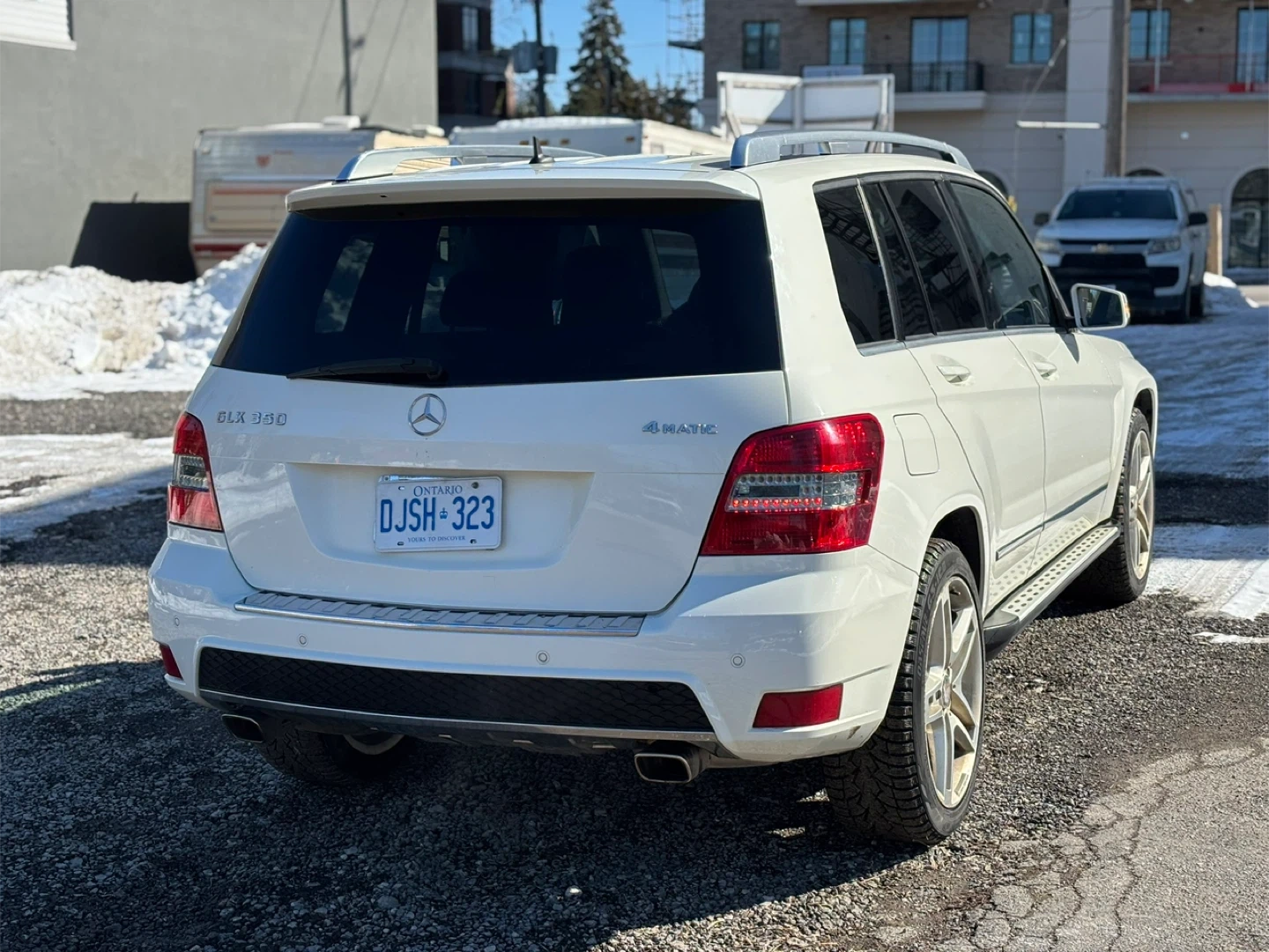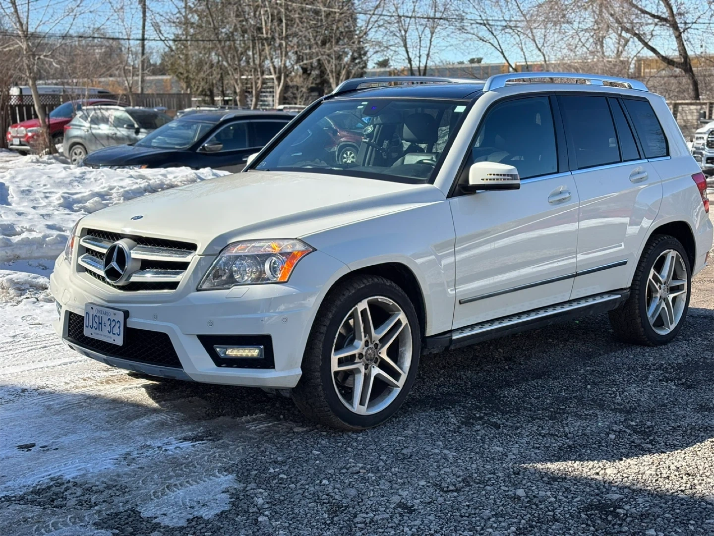 White 2012 Mercedes-Benz GLK 350 SUV with 4MATIC all-wheel drive. This vehicle is equipped with stylish alloy wheels and roof rails. It's a reliable option for various driving conditions. This SUV offers comfort and practicality for daily commutes or longer .