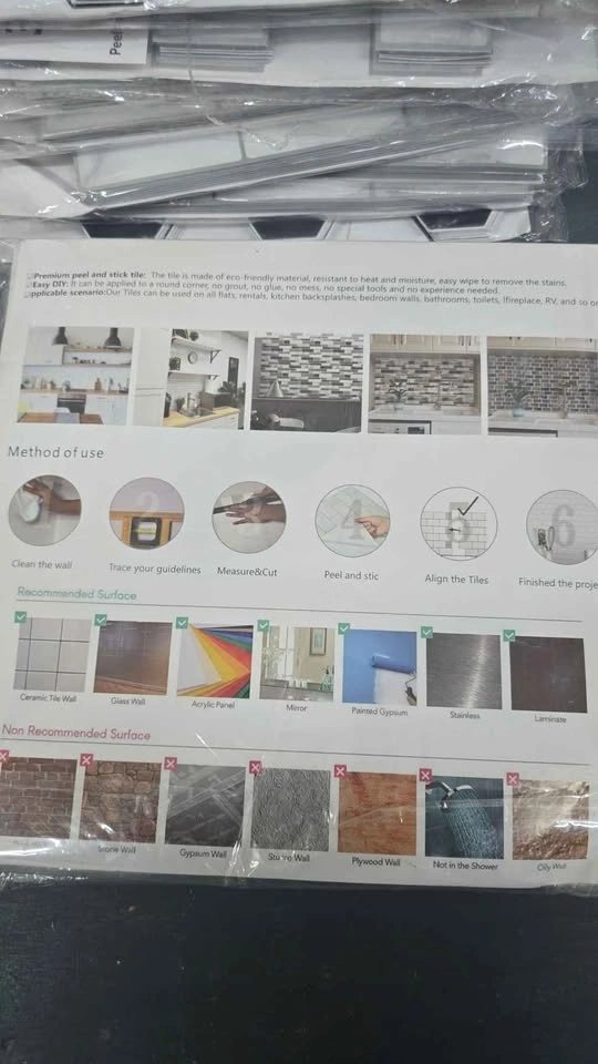 Upgrade your kitchen or bathroom instantly with our Peel & Stick 3D Waterproof Wall Tiles! Waterproof & Heat Resistant. Easy DIY Installation – No Glue Needed. Perfect for Kitchen Backsplash & Bathroom Walls. Modern 3D Design. Easy to Clean. Special Clearance Price: ONLY $20 per pack. 1 Pack = 10 Pieces. Let me know if you're interested!