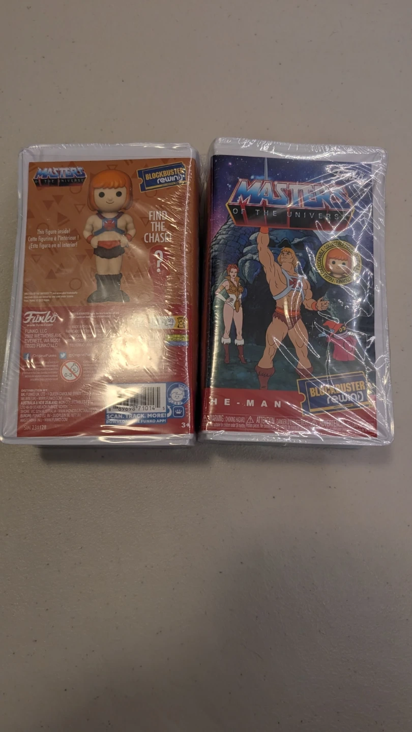 This is a sealed Funko Pop! vinyl figure from the Masters of the Universe collection, featuring He-Man with a Blockbuster Rewind theme. It's still in its original packaging, ready for display. This collectible would be a great addition for any Masters of the Universe fan!