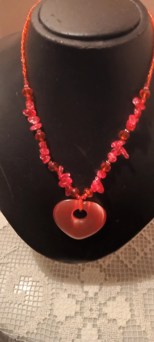 This is a beaded necklace featuring a orange heart-shaped pendant. It's made with small orange beads and a larger, smooth orange pendant with a cutout. The clasp is a lobster claw style.