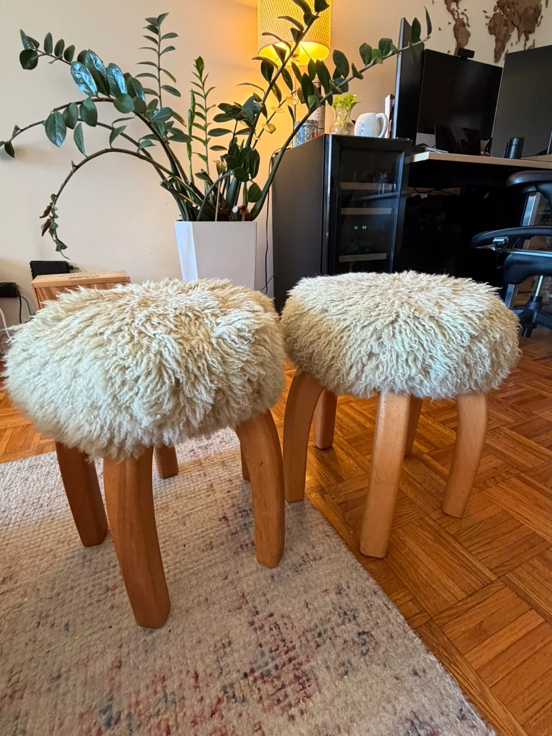 Pair of sheepskin stools with solid wood legs. Gently used, minor marks on legs (see photos). Very sturdy and stylish. Selling as a set preferred.