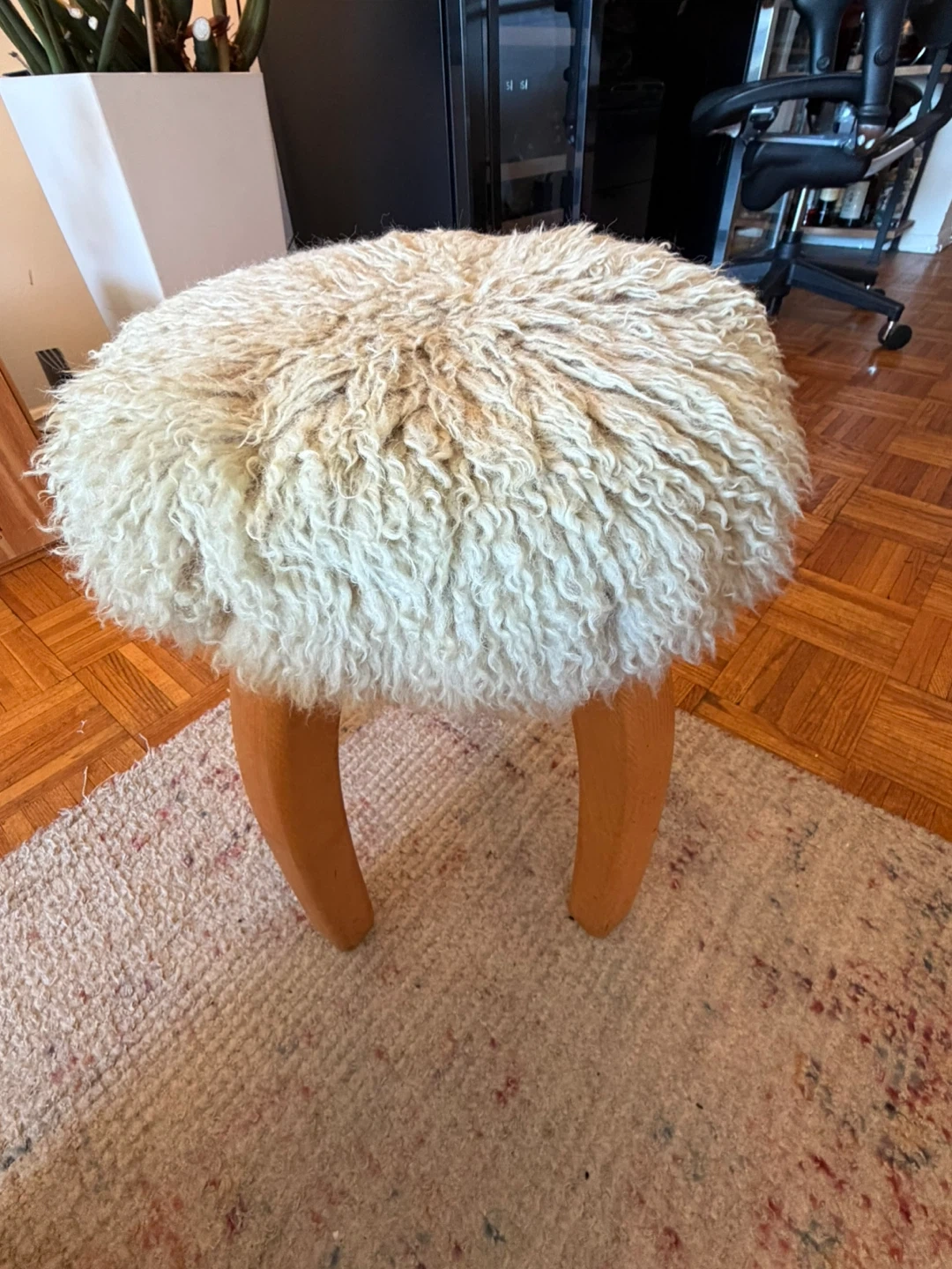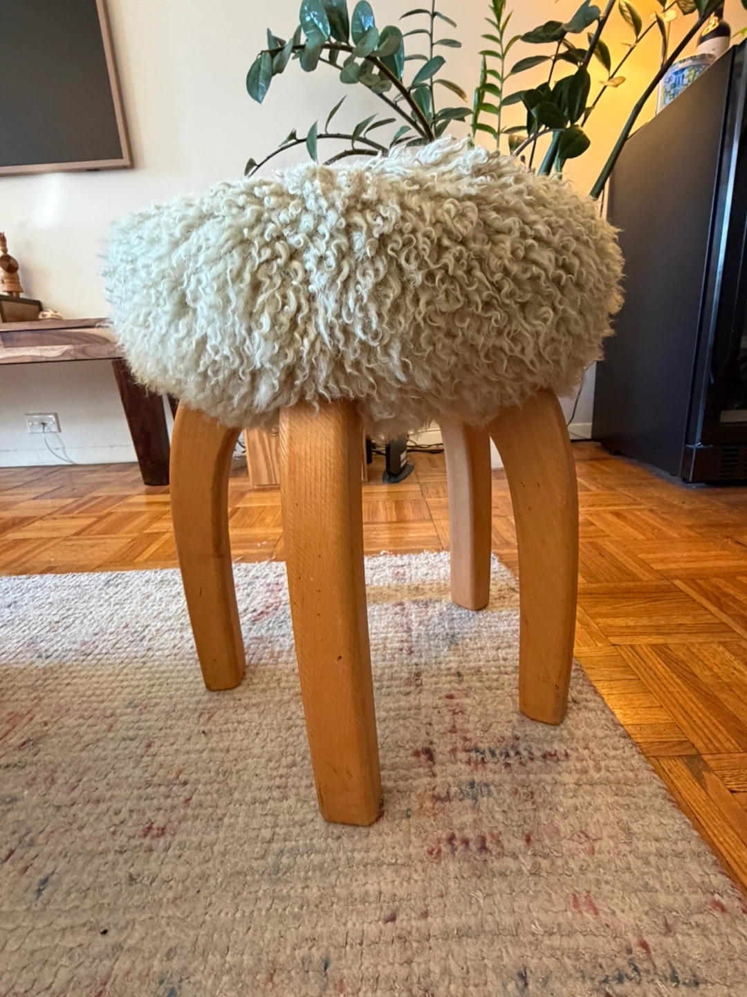 Pair of sheepskin stools with solid wood legs. Gently used, minor marks on legs (see photos). Very sturdy and stylish. Selling as a set preferred.