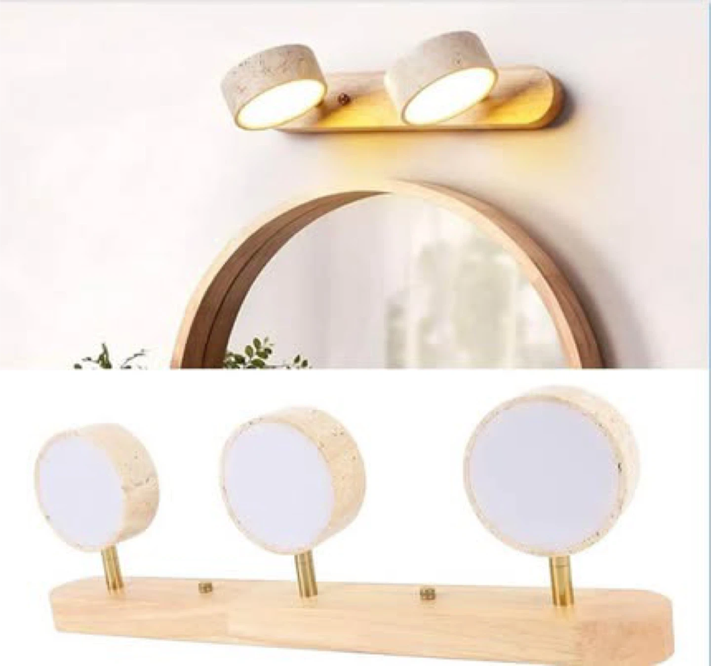 A modern wall light featuring a natural wood base and three adjustable lamp heads. The lamp heads can rotate 180 degrees, allowing you to direct the light where you need it most. This fixture uses a clean, contemporary design suitable for various room aesthetics.