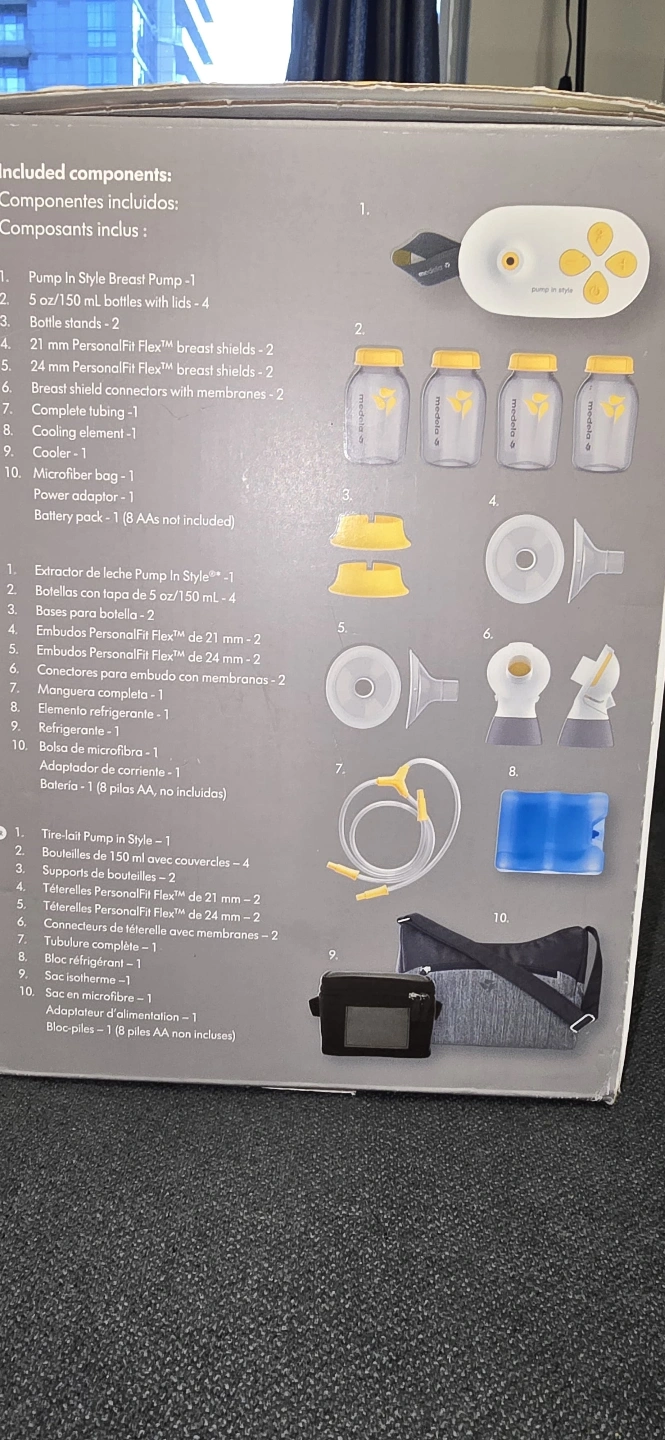 Double electric breast pump. Includes bottles, breast shields, connectors, tubing, and cooler bag. Portable and easy to use. Great for busy moms.
