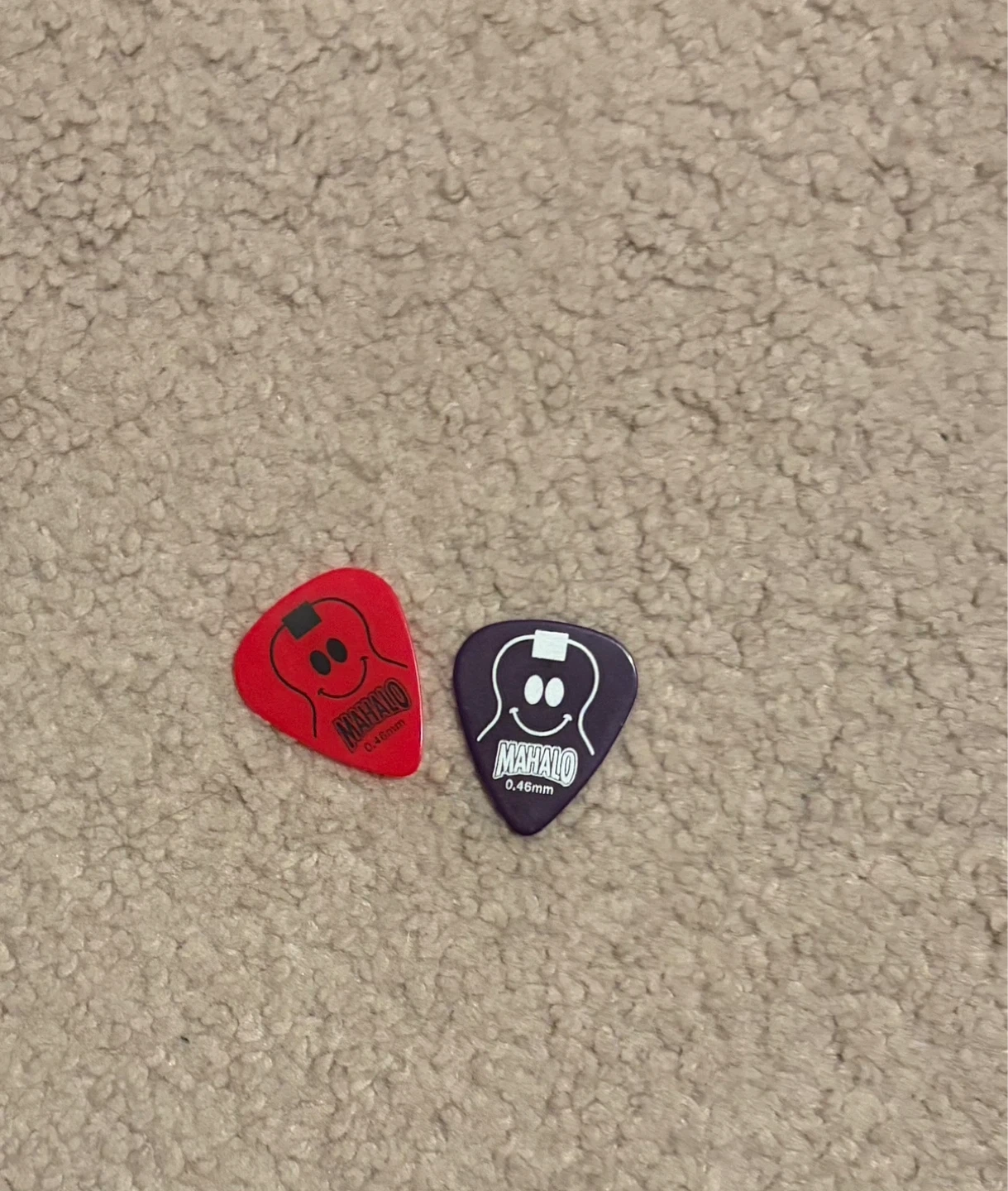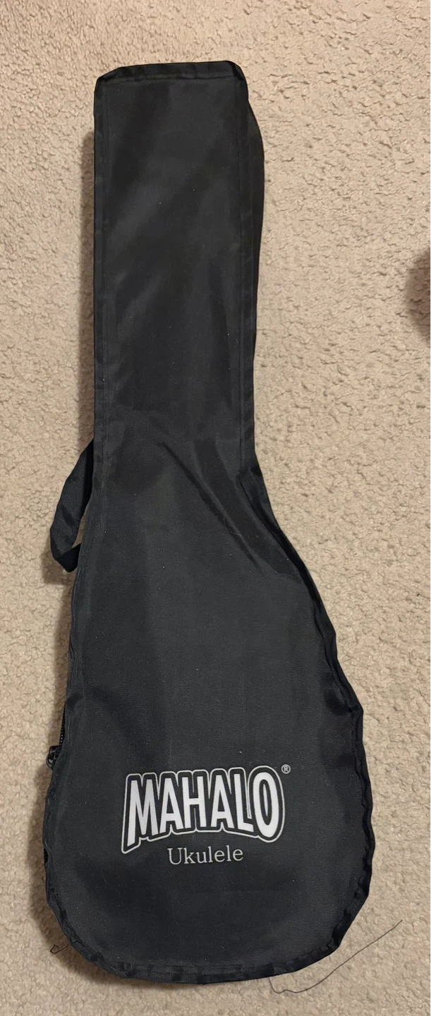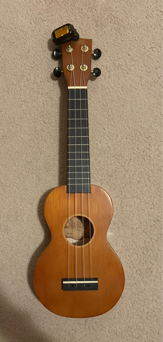 Mahalo ukulele with a gig bag and two picks. Includes a clip-on tuner. The ukulele is a warm brown colour. The picks are 0.45mm.