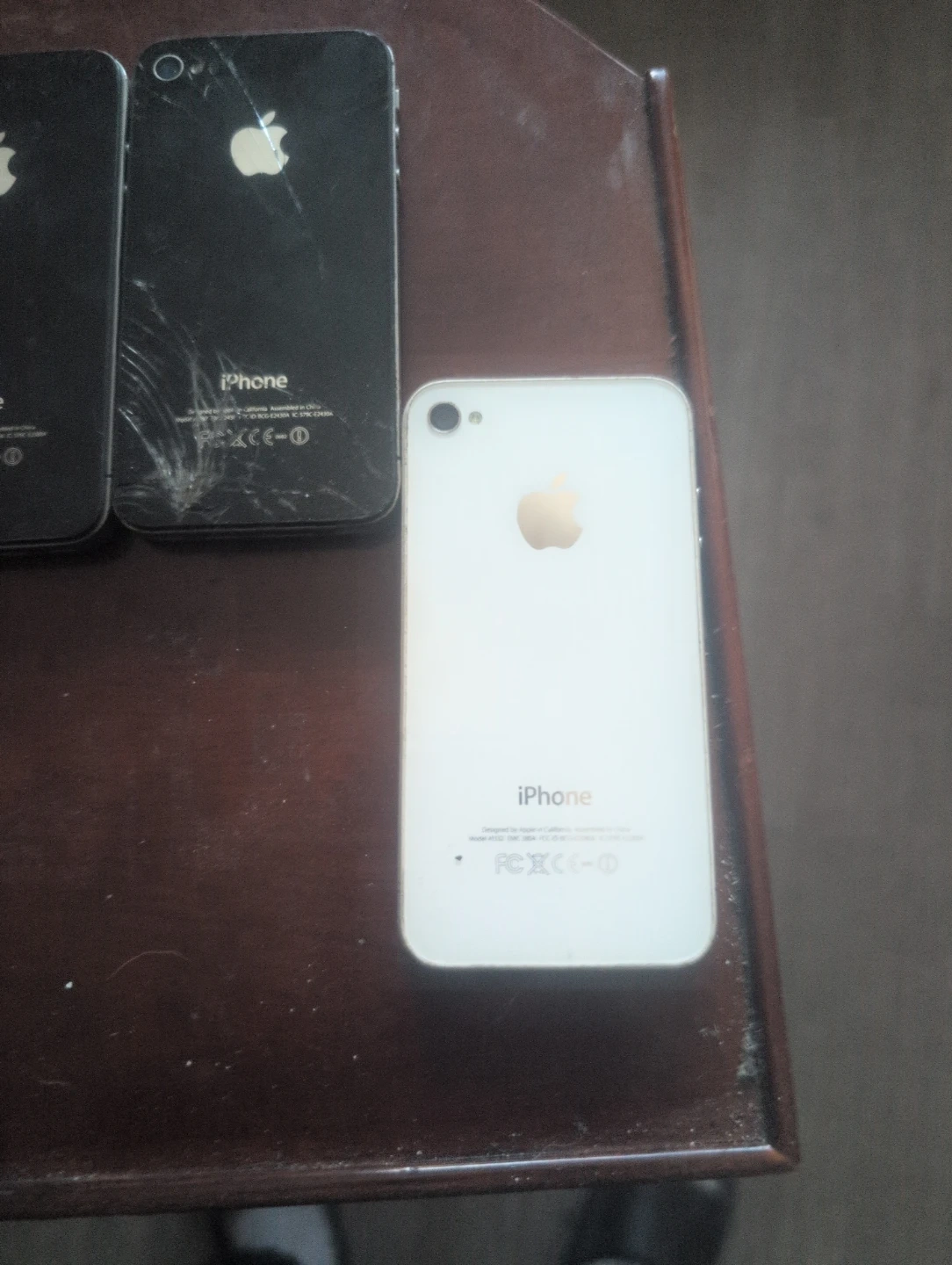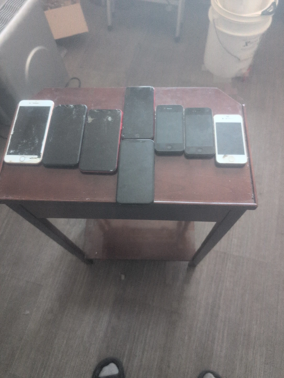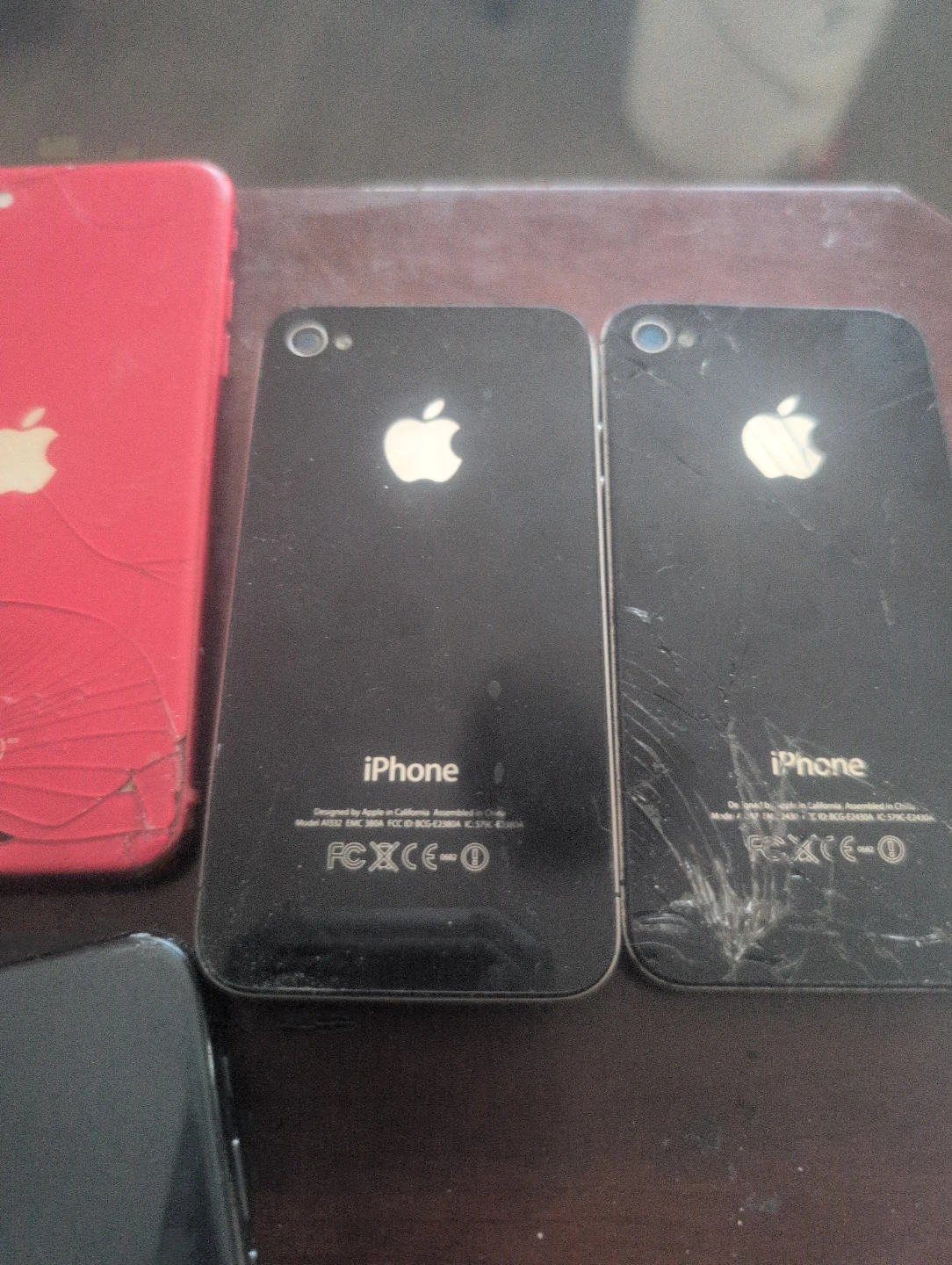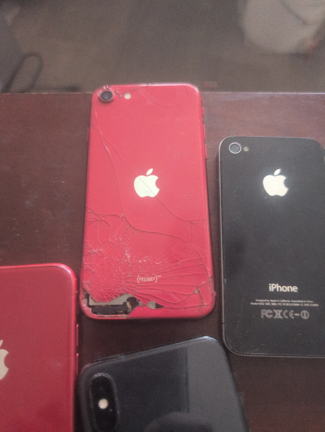 Selling a group of iPhones in various colours. Includes red, black, and white models. The phones show signs of wear and tear, with visible cracks on some of the screens and backs. Perfect for parts or repair projects!