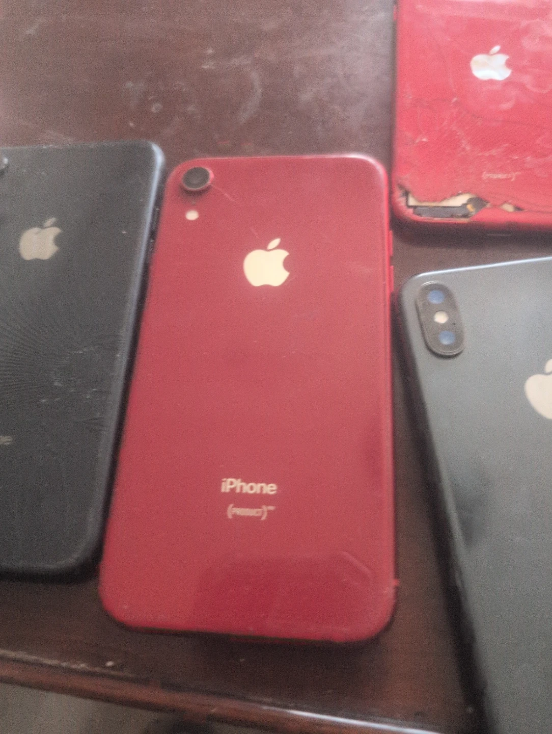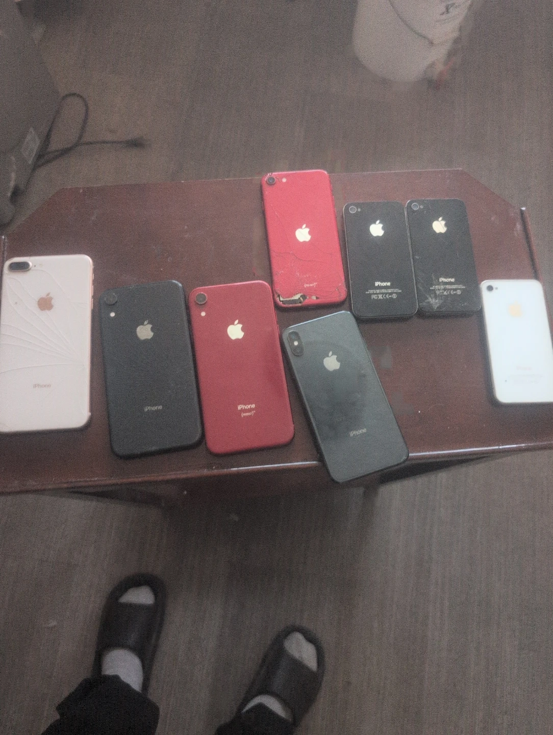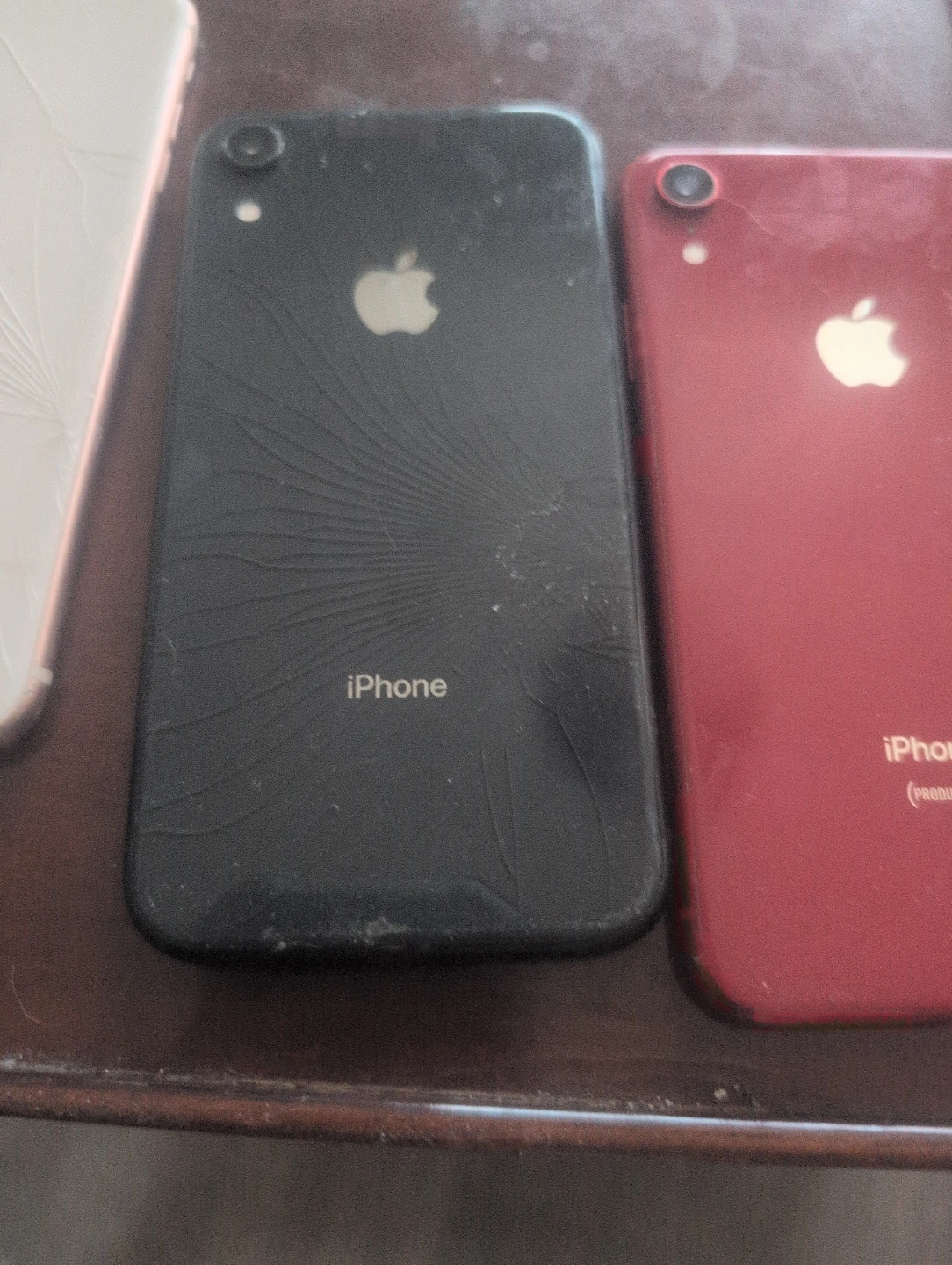 Selling a group of iPhones in various colours. Includes red, black, and white models. The phones show signs of wear and tear, with visible cracks on some of the screens and backs. Perfect for parts or repair projects!