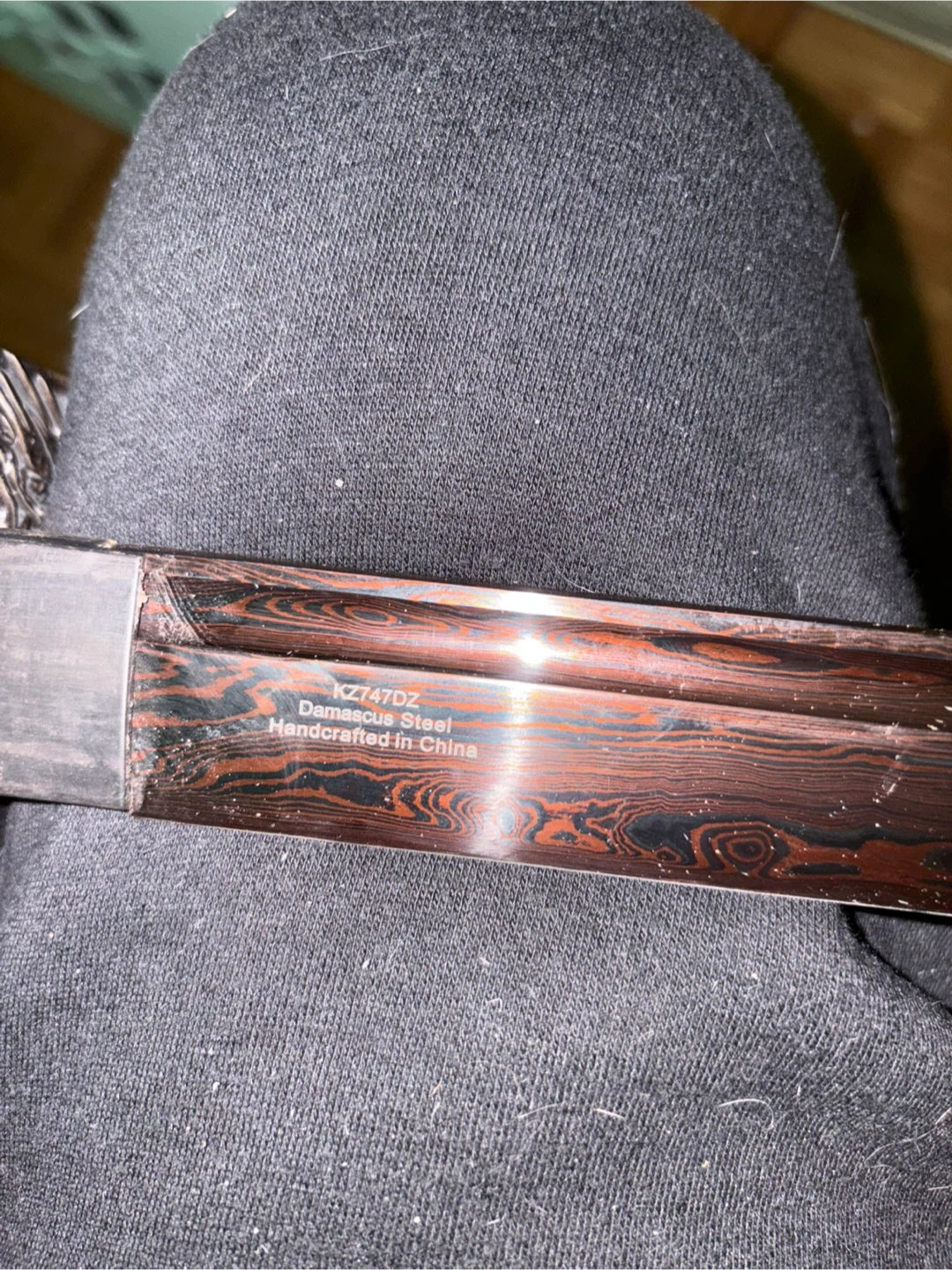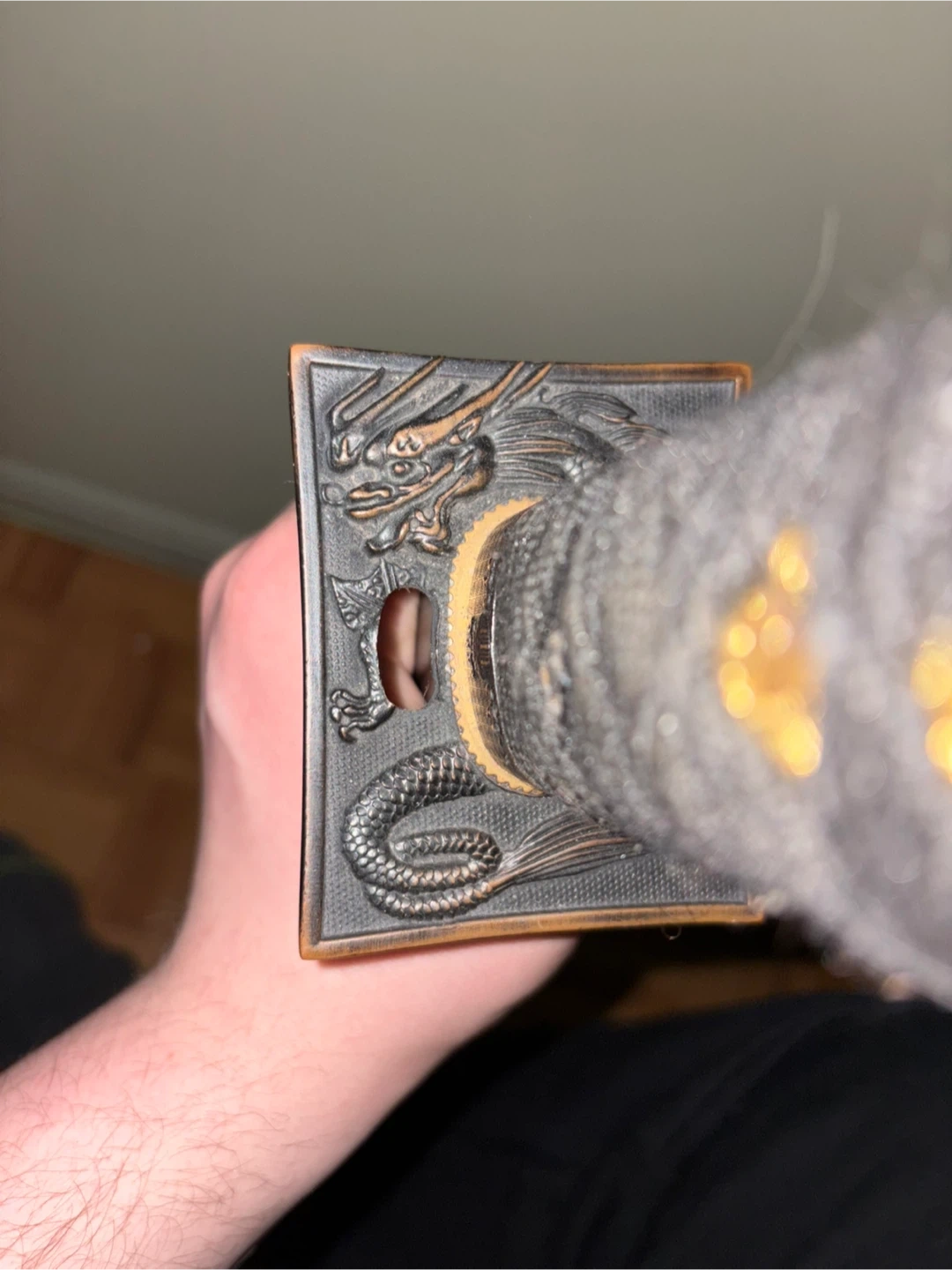Shinwa Black Knight Ninja Sword, Damascus Steel, Ray skin, hardwood sheath handcrafted in China. It's made with Damascus steel and features an intricately designed dragon on the guard. The handle is wrapped for a secure grip. 1024 layers of Damascus steel.