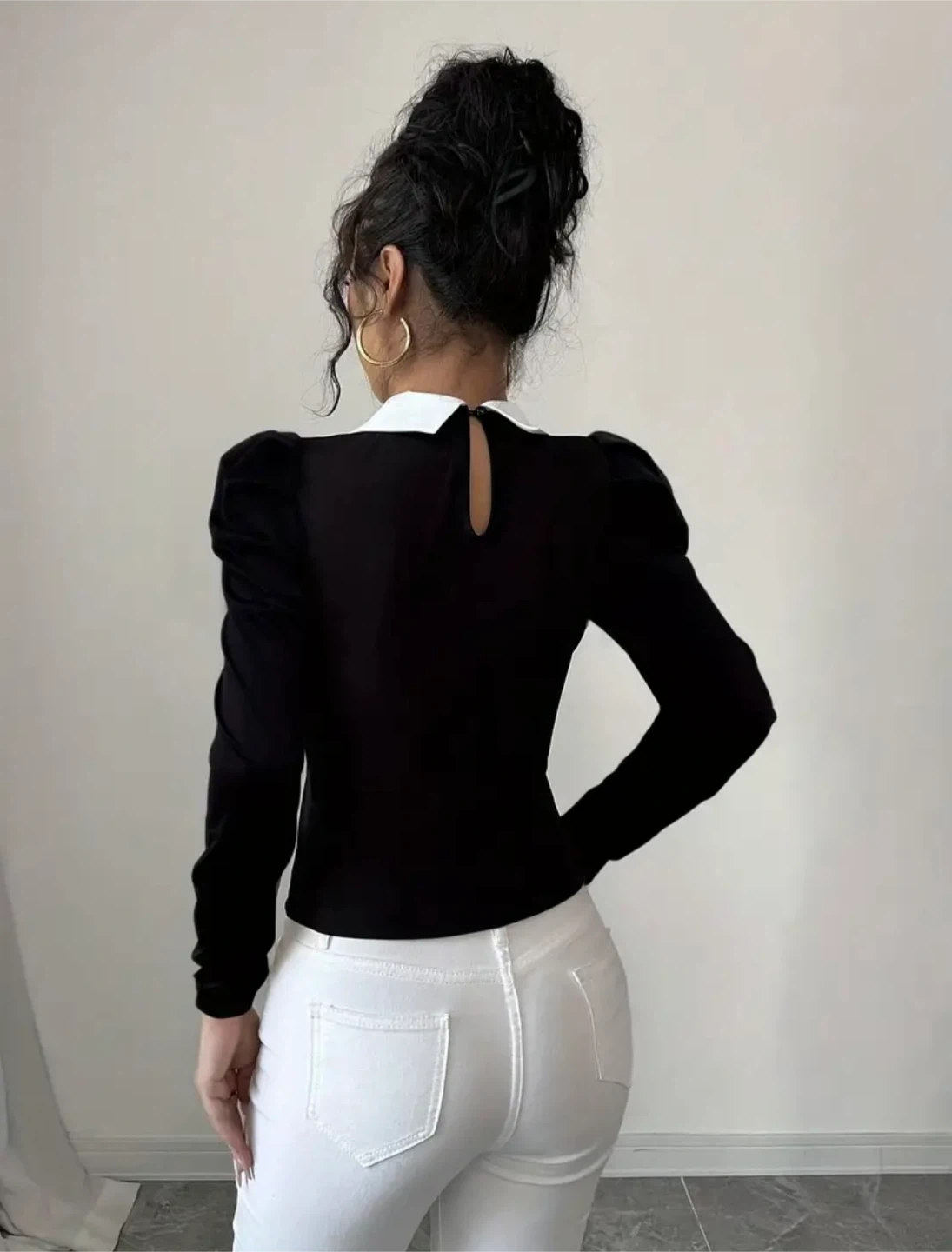 New Black Puff Sleeve Top with White Collar & Pearl Details
