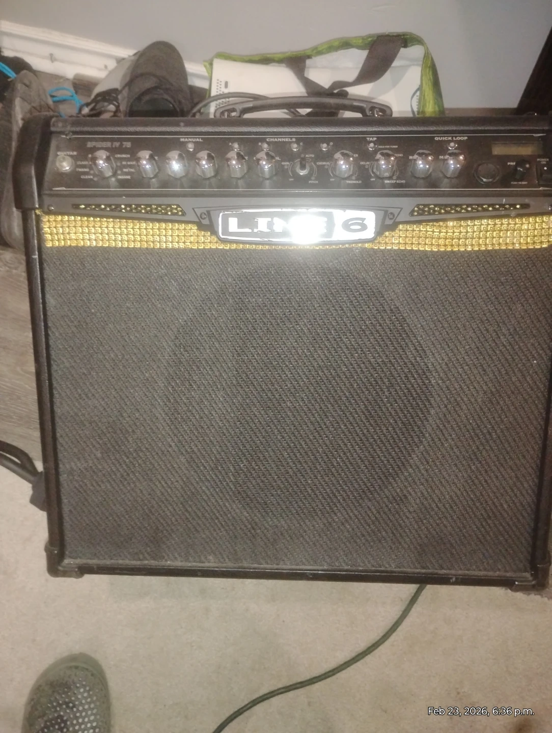 This is a Line 6 Spider IV 75 guitar amp. It's a 75-watt amplifier with a 1x12 speaker. It features multiple amp models and effects. It's suitable for practice or small gigs.