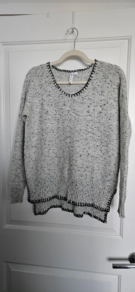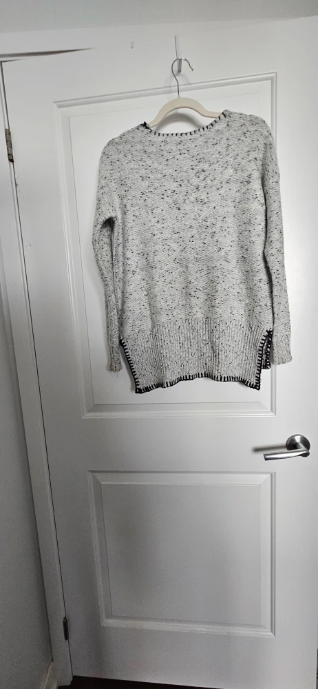 Selling a Cable & Gauge sweater in size XS (but fits a small). It's a light grey colour with black detailing around the neck and hem. It's a comfy, stylish piece perfect for layering!