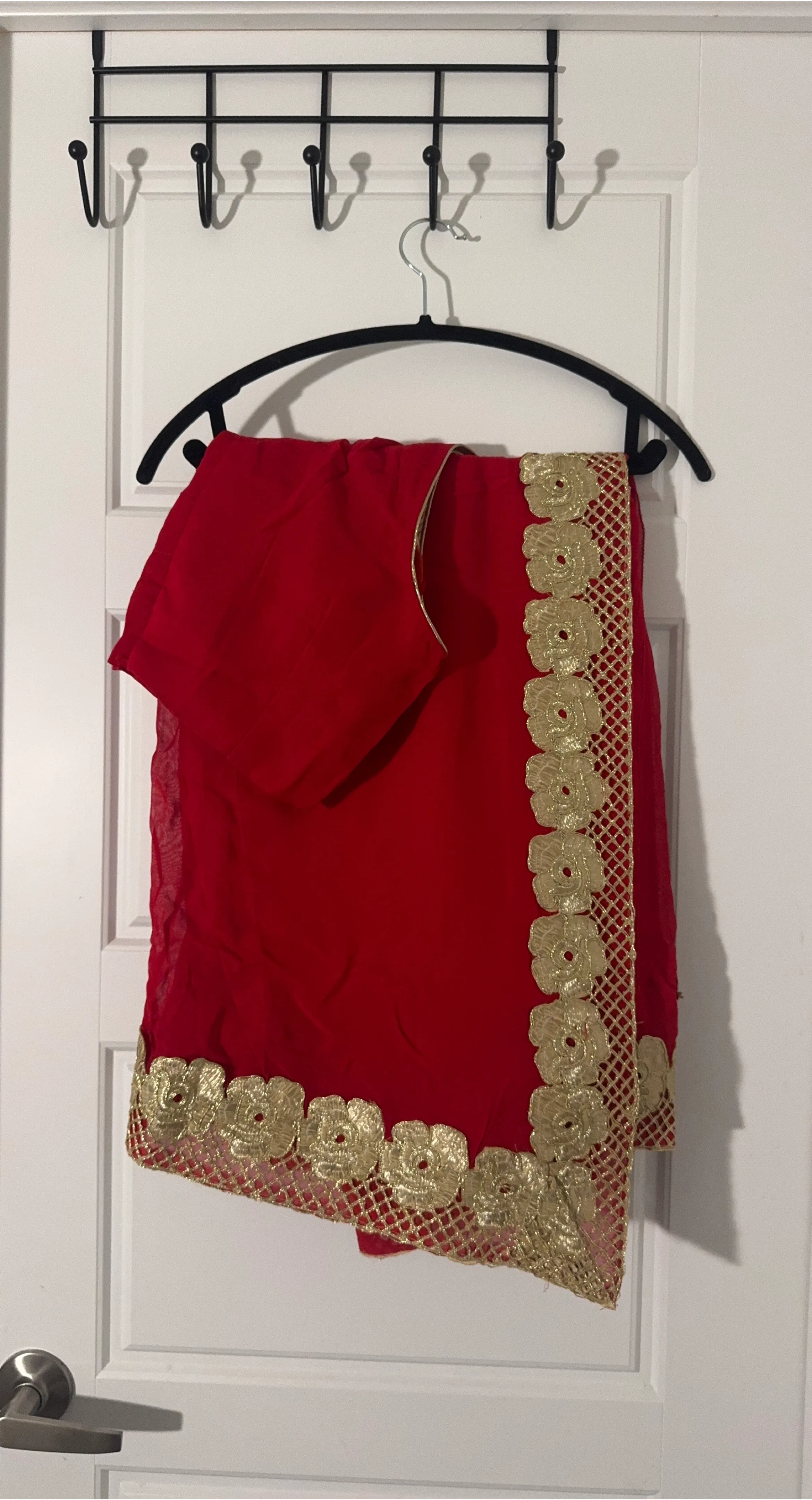 Beautiful red saree with an intricate gold floral lace border. It comes with a matching red blouse piece, which has gold trim. Perfect for cultural events or special occasions!