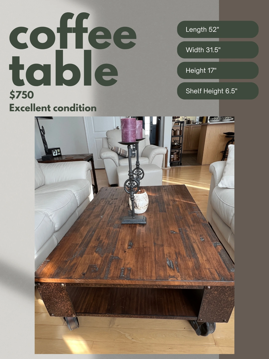 Coffee Table - Solid Wood on Cast Iron Lockable Wheels