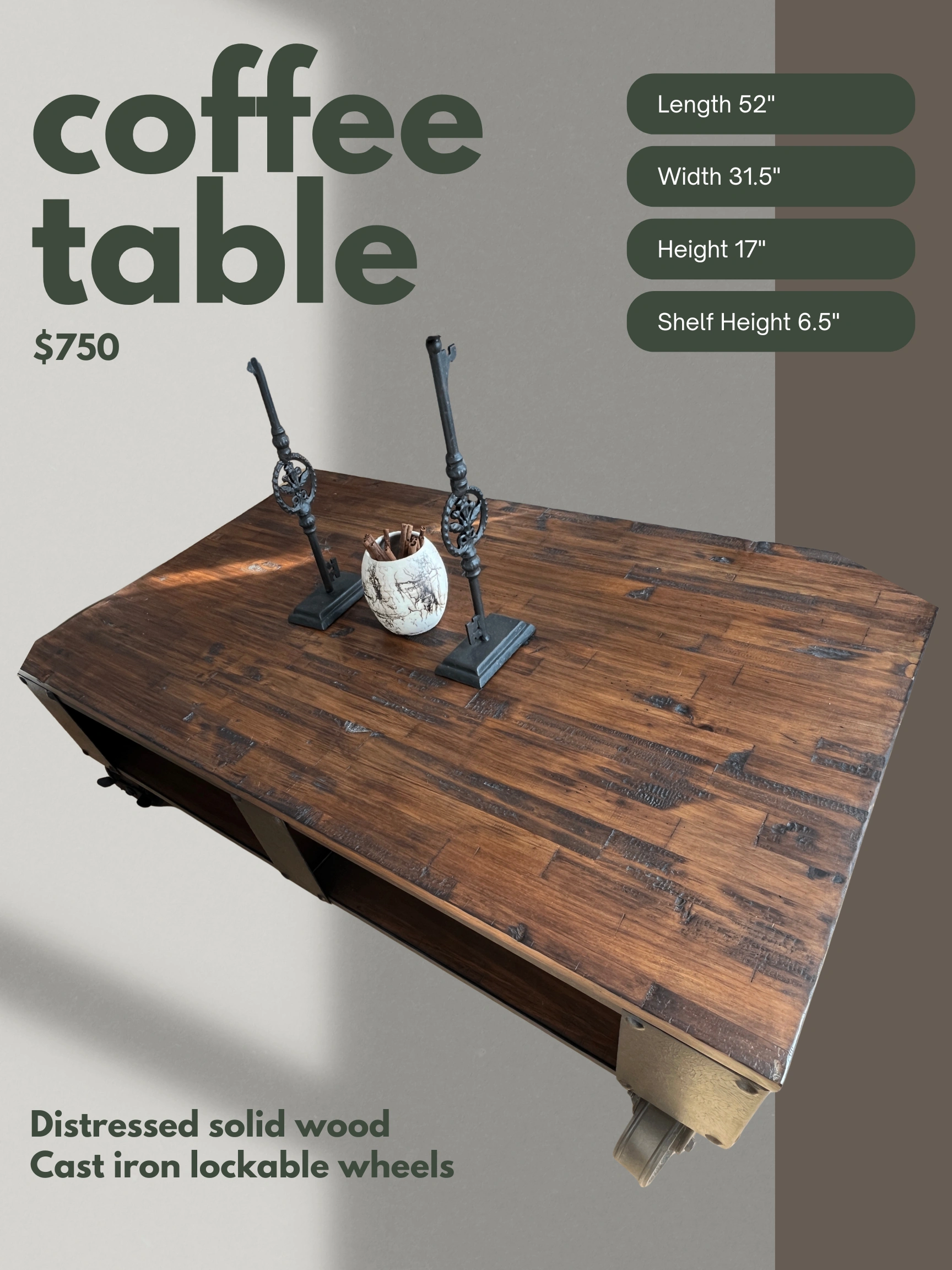 Coffee Table - Solid Wood on Cast Iron Lockable Wheels