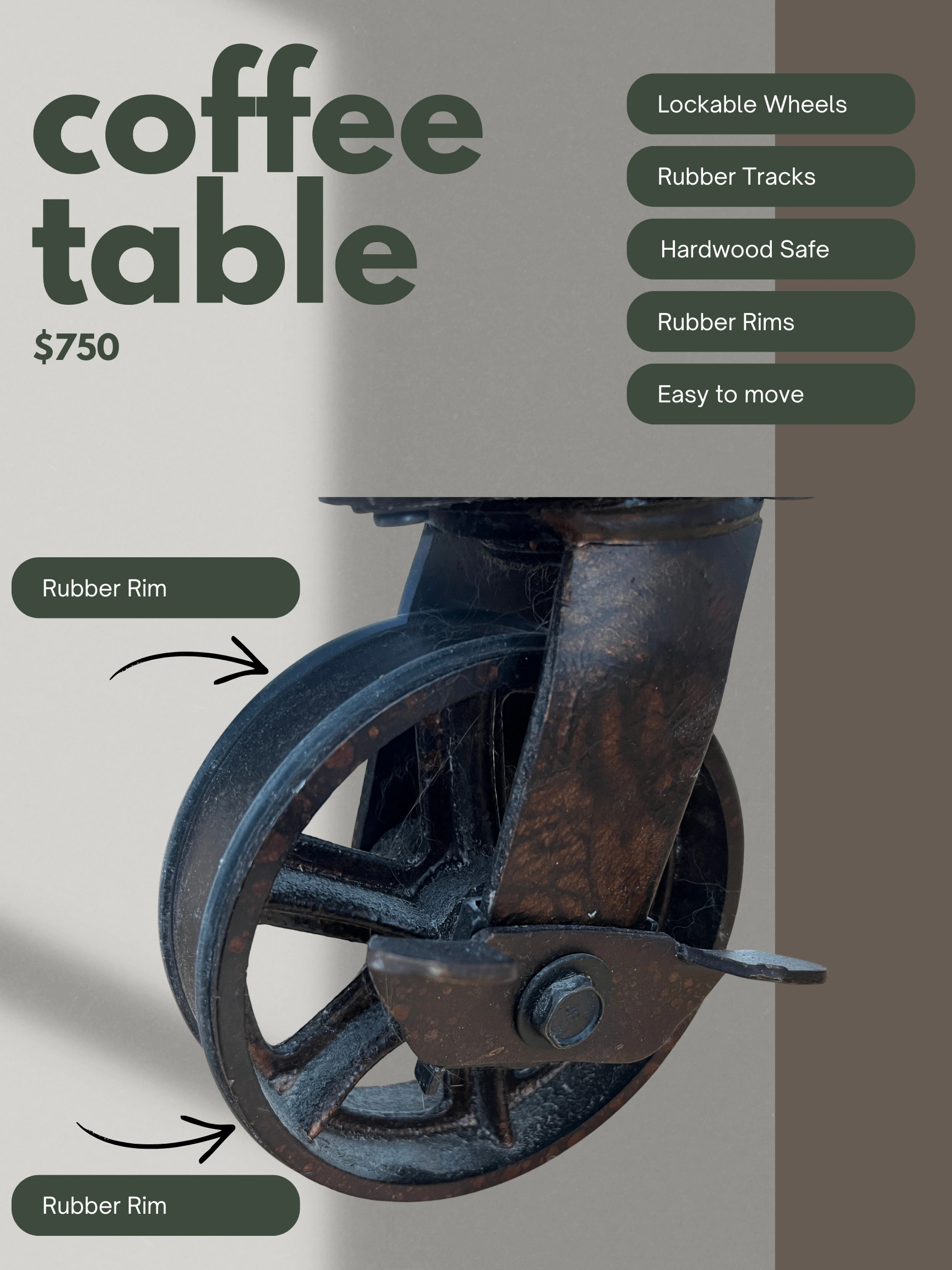 Cast Iron lockable wheels with rubber rims to protect hardwood floors