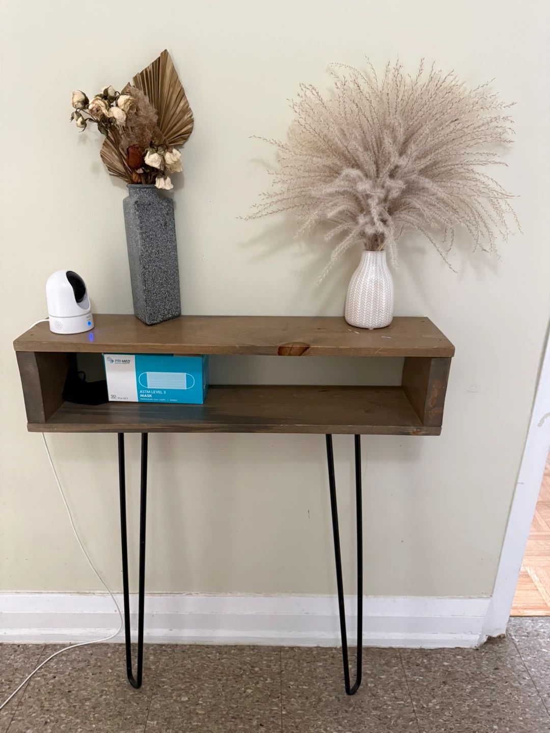 This console table features a rustic wood top and a handy open shelf. It's supported by sleek black metal hairpin legs. Perfect for entryways or narrow spaces, it adds a touch of modern farmhouse style.