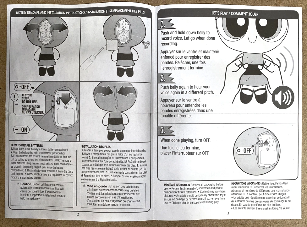 -Press the belly to record what you say and hear it back in doll’s voice.