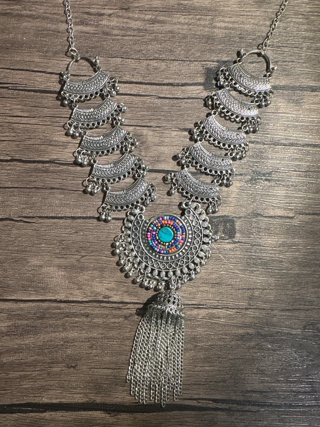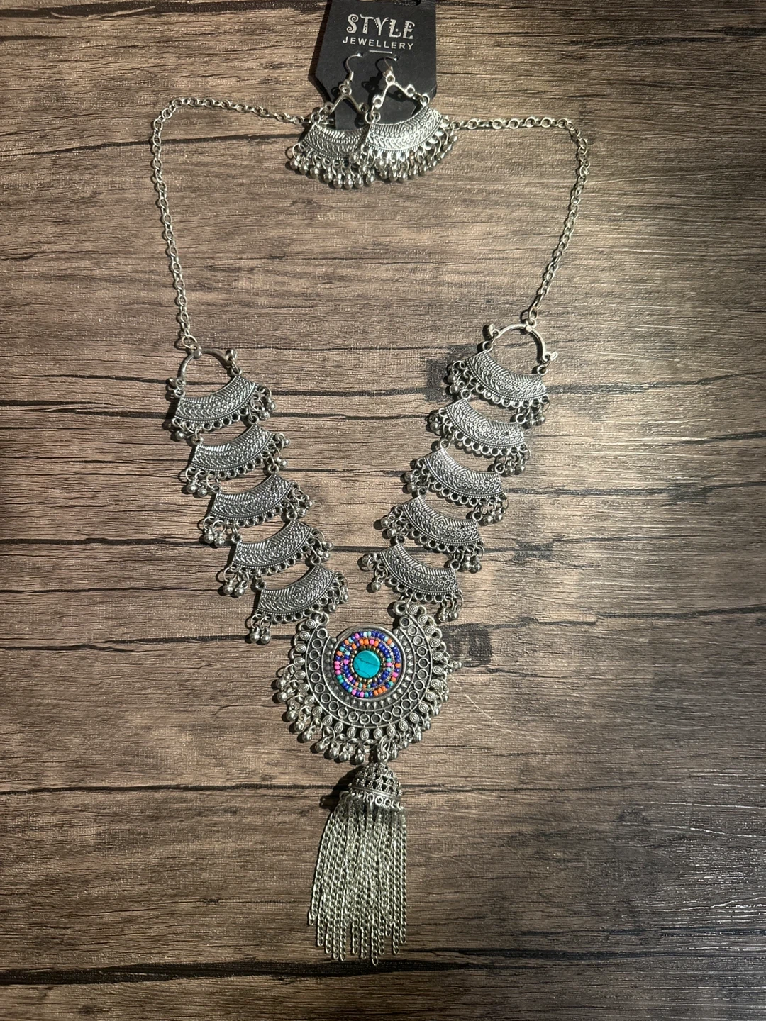 Selling a beautiful necklace and earring set from Style Jewellery! The set is silver in colour, with a unique design. The necklace has a large pendant featuring colourful beads in the centre. The matching earrings complement the necklace perfectly!