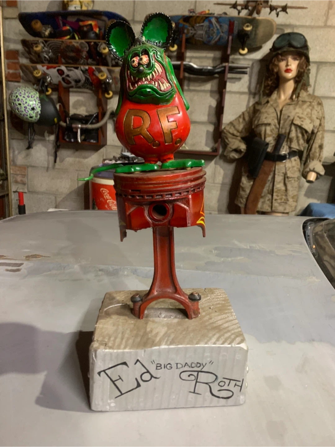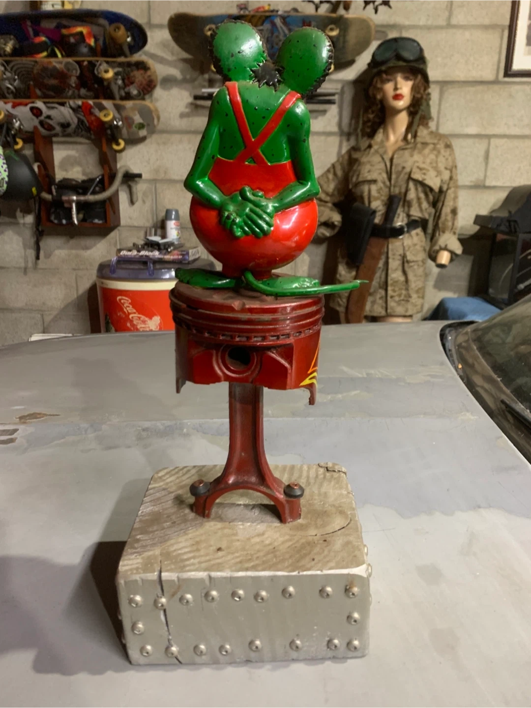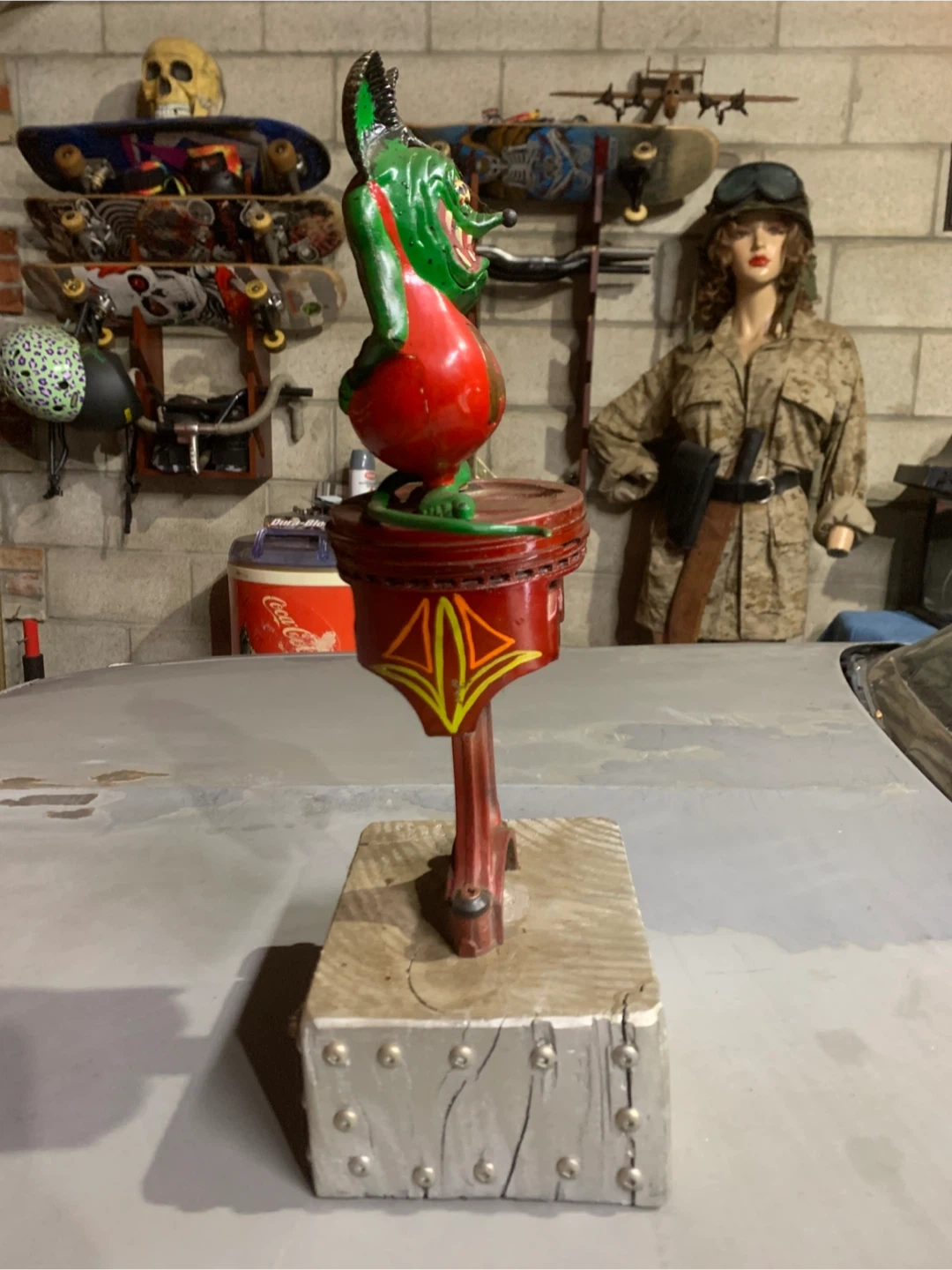 Stands just under 17” tall. Found in an old garage estate sale I have no knowledge of how old it is or the artist/maker. Needs to be cleaned It is really dirty from age and may smell like car exhaust & cigars lol. Figure is made of hollow hard plastic. The piston is a real metal car piston with a solid wood base.