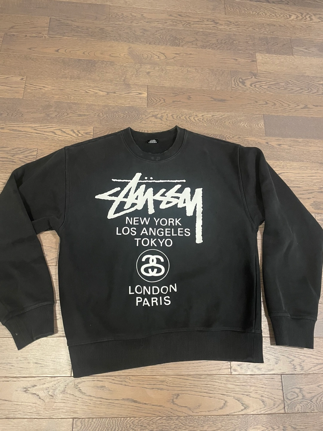 Black Stüssy crewneck sweatshirt. Size Large. Features various city names including New York, Los Angeles, Tokyo, London, and Paris. Made in Romania.