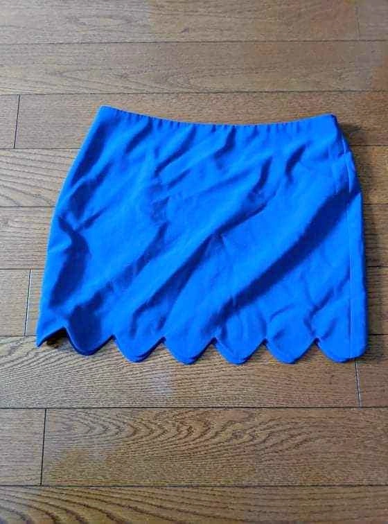 Blue scallop edged skirt (in medium). Sits at mid thigh. Very flattering. Pick up at Lawrence/Keele.