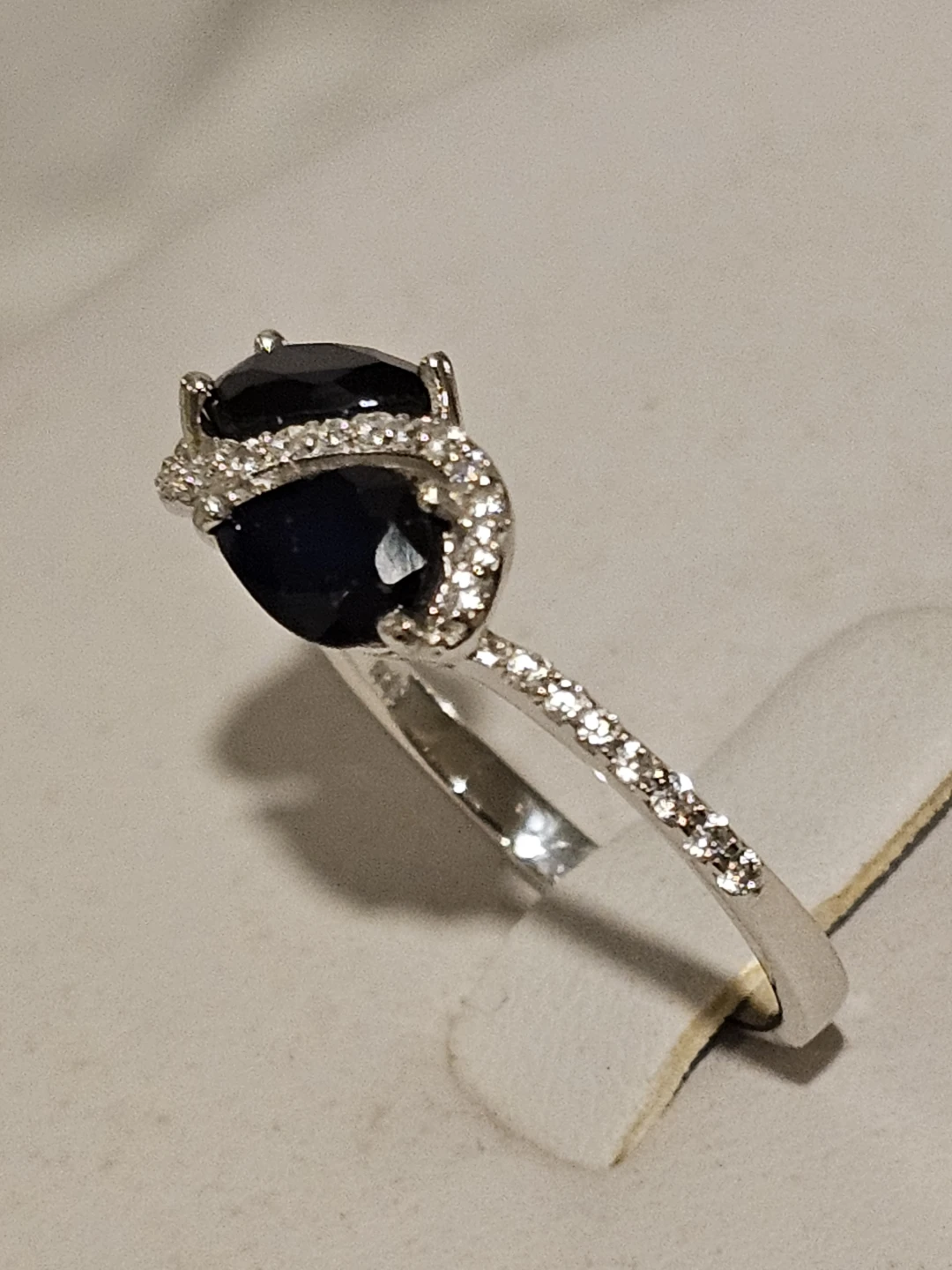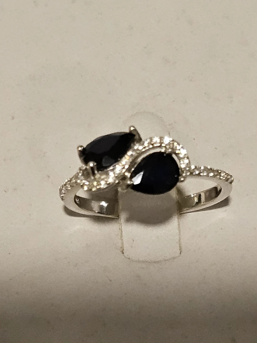 Sterling Silver Pear Cut Sapphire and Simulated Diamond Ring