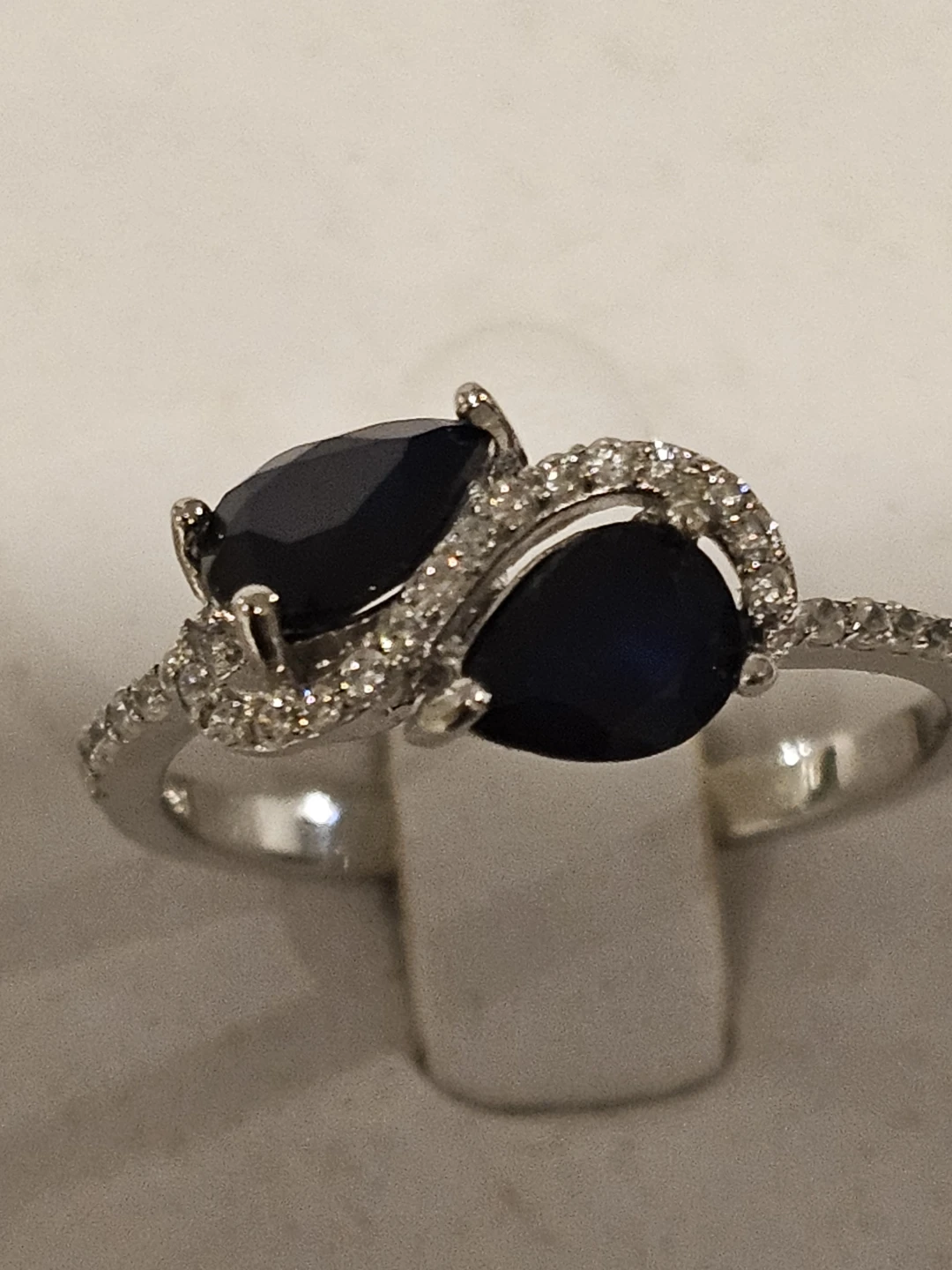 A sterling silver ring featuring two pear-cut blue sapphires and a halo of small simulatrd diamonds. This elegant ring is perfect for adding a touch of sparkle to any outfit! It's a beautiful piece for special occasions.