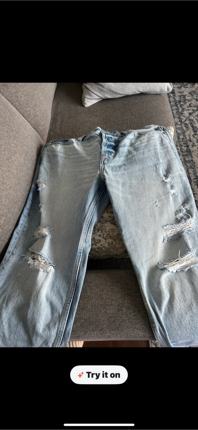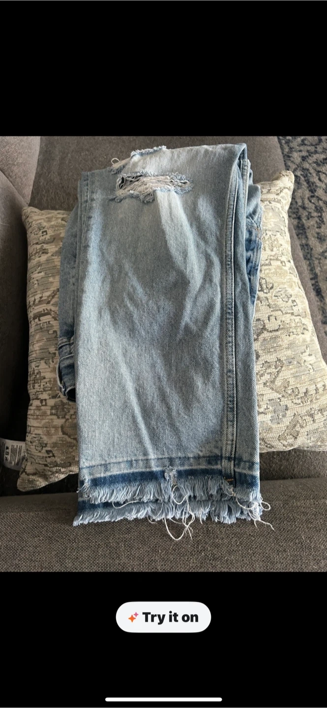 Light wash denim jeans from Old Navy. Straight leg style with distressed details and frayed hem. Size 12.