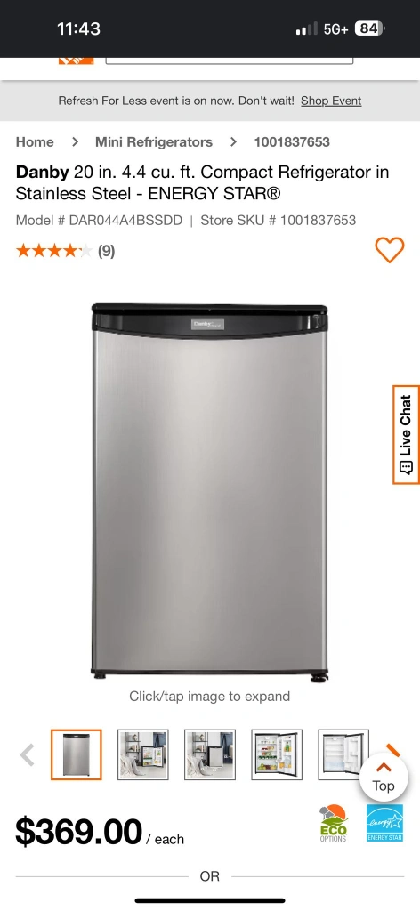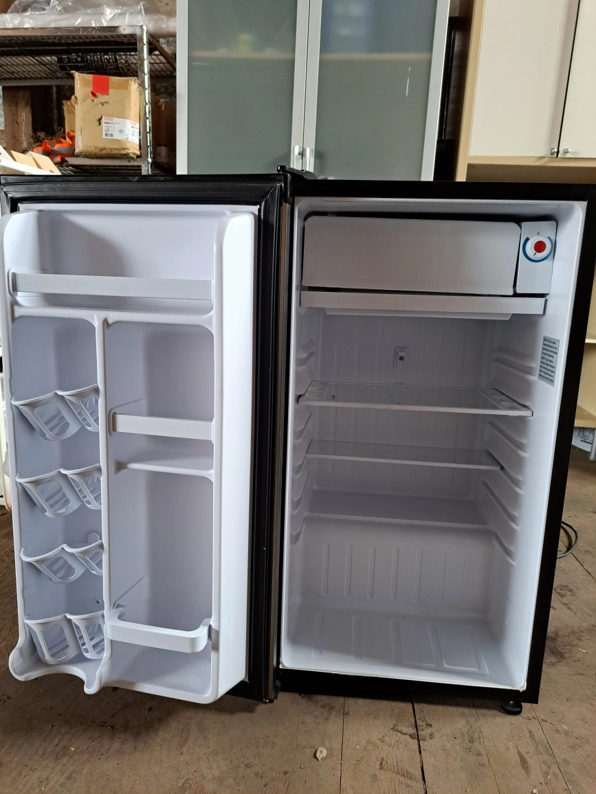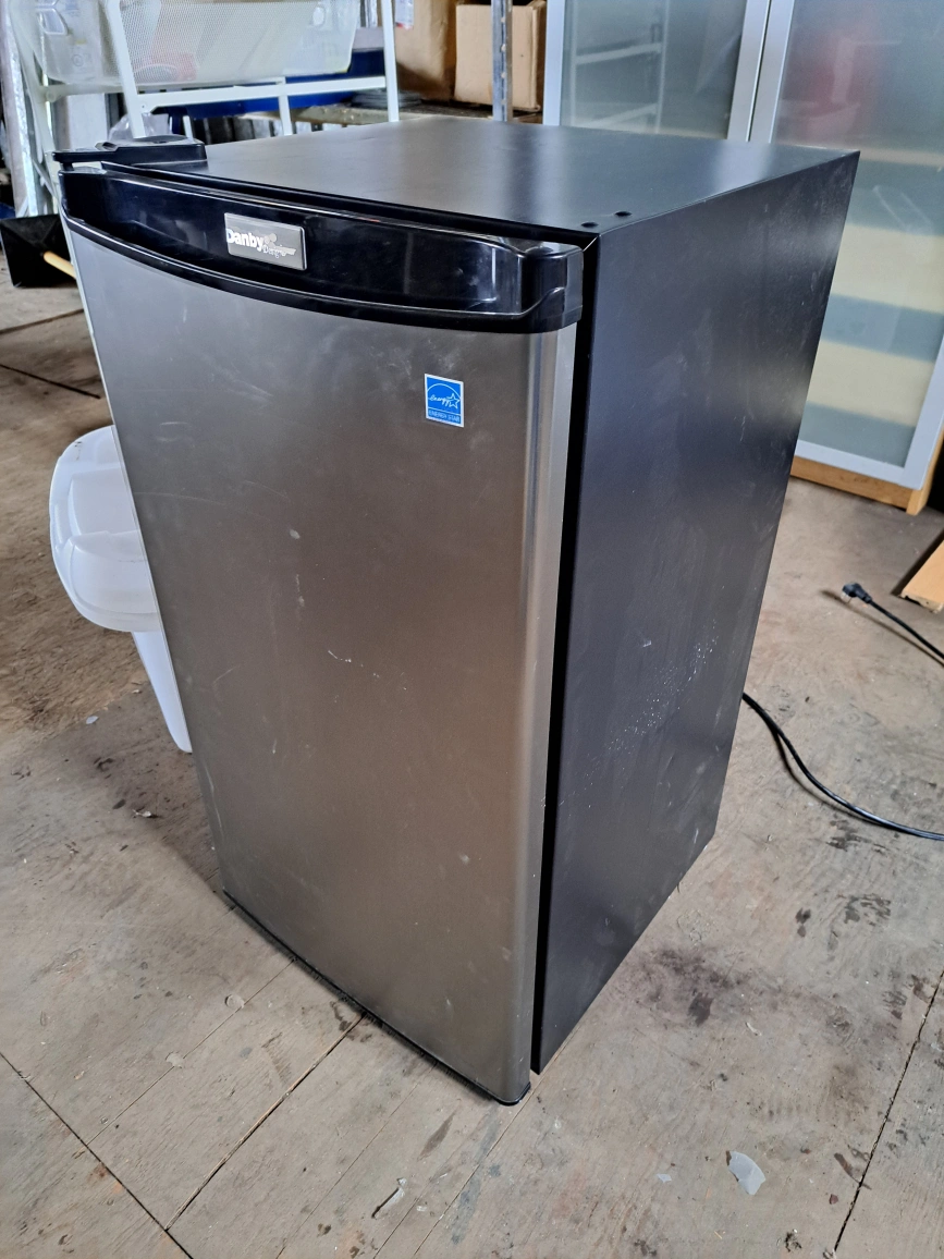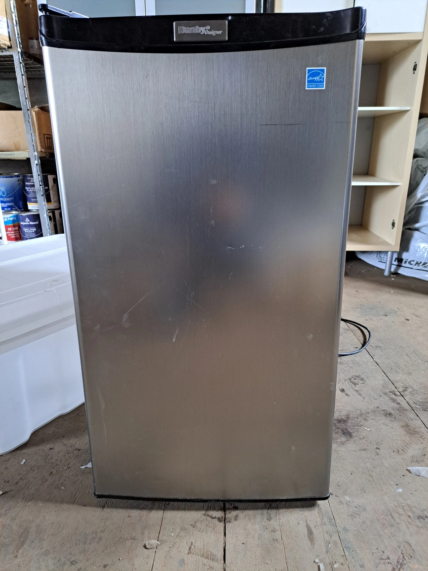Compact refrigerator, . Energy Star rated. Stainless steel finish. Model # DAR044ABSSDD. Minor cosmetic imperfections.