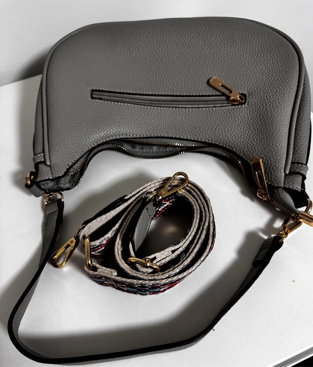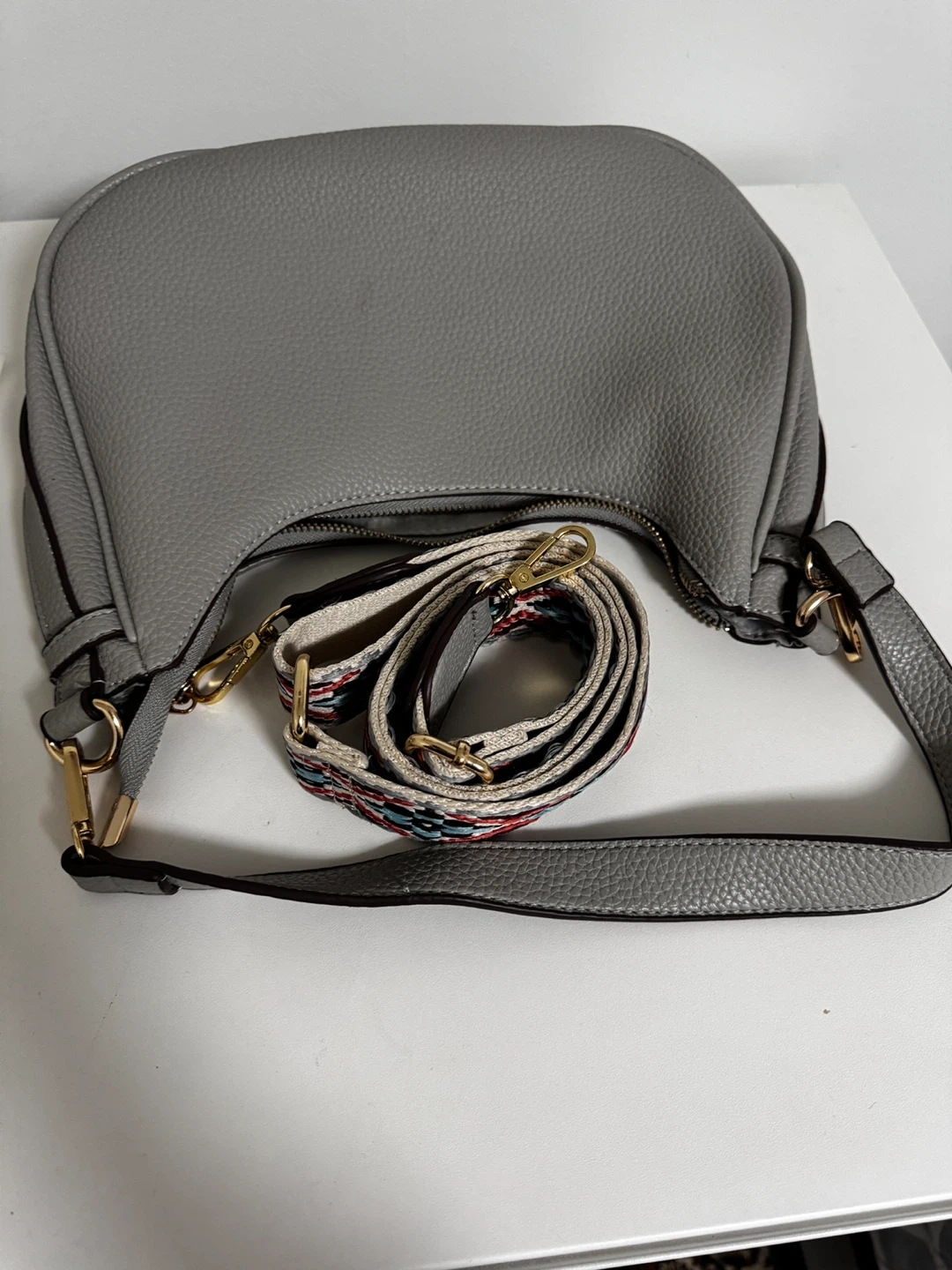 This gray hobo bag is made of textured faux leather. It features a zip-top closure and an exterior zip pocket. Comes with a detachable, adjustable patterned strap. Interior has a zip pocket and slip pockets.
