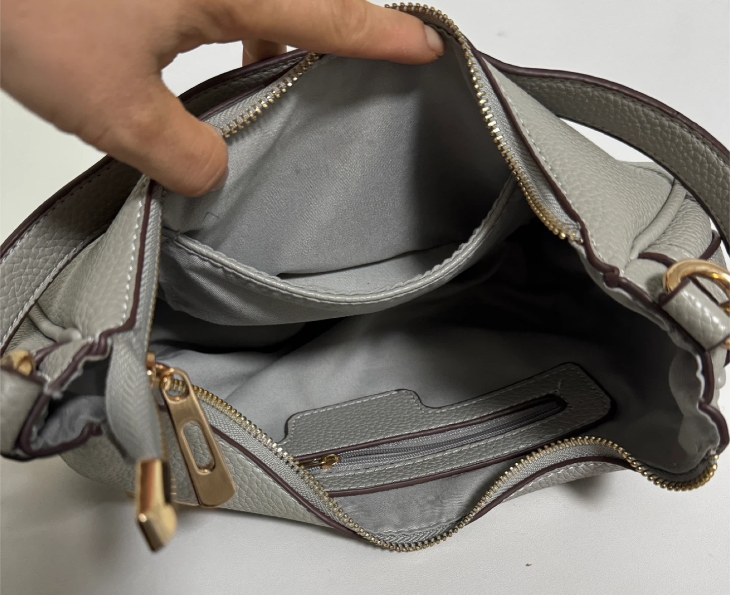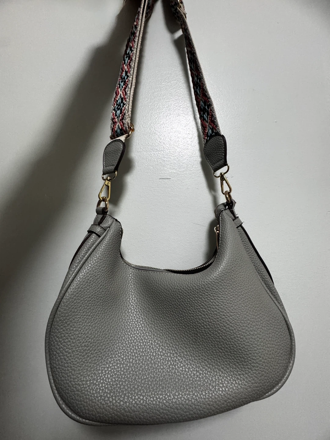 This gray hobo bag is made of textured faux leather. It features a zip-top closure and an exterior zip pocket. Comes with a detachable, adjustable patterned strap. Interior has a zip pocket and slip pockets.