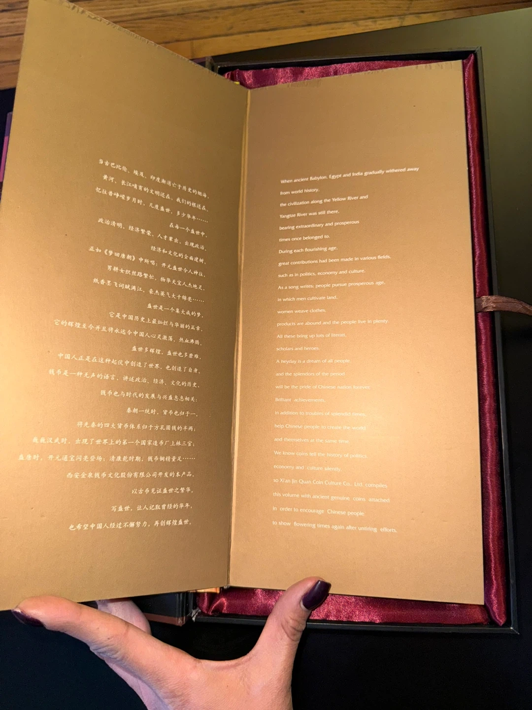 Includes historical artwork, cultural text, and mounted replica ancient Chinese coins presented in a stunning gift box.