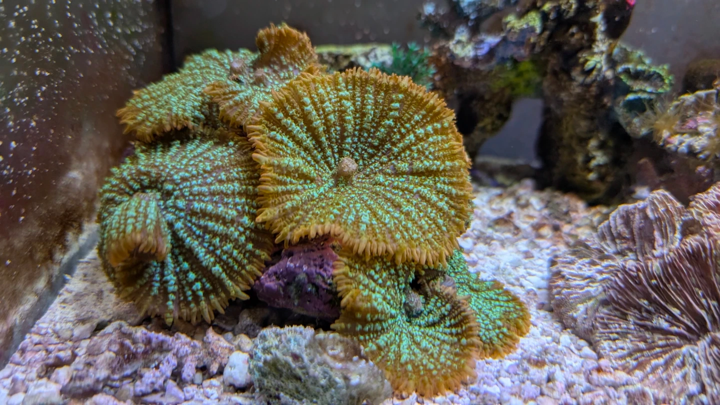 Healthy mushroom coral colony with vibrant green and orange colours. It's attached to a small rock for easy placement. This coral adds beautiful texture and colour to any reef aquarium.