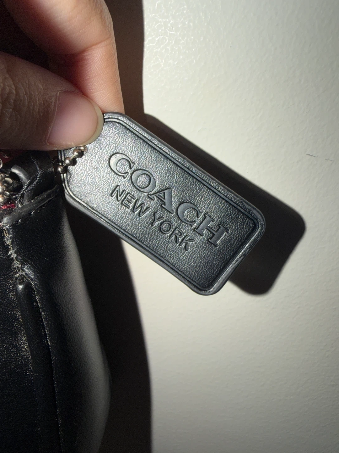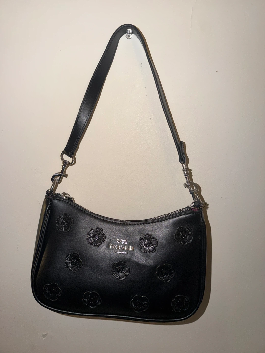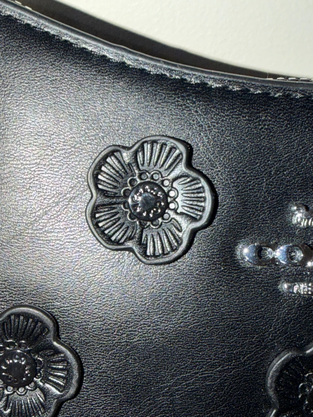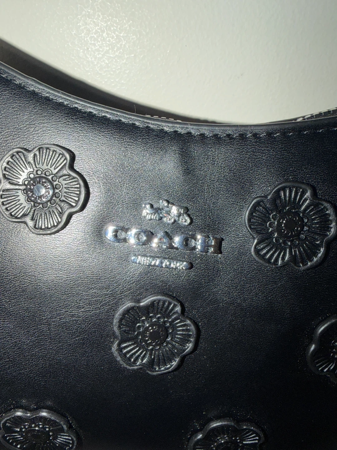 This is a black leather shoulder bag from Coach. It features a floral embossed design all over. The bag has a single strap with silver-tone hardware.