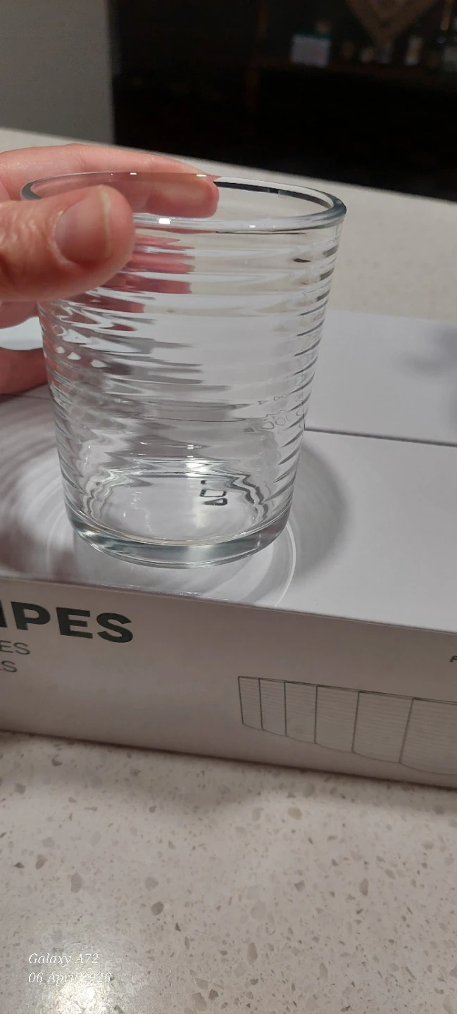 Set of 6 clear glass tumblers with a ribbed stripe design. Each glass holds 260ml or 8.7 oz. The box is included.