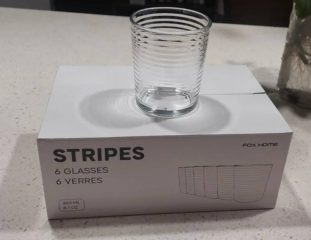 Set of 6 clear glass tumblers with a ribbed stripe design. Each glass holds 260ml or 8.7 oz. The box is included.