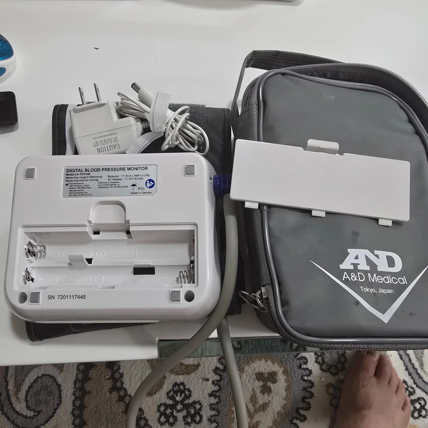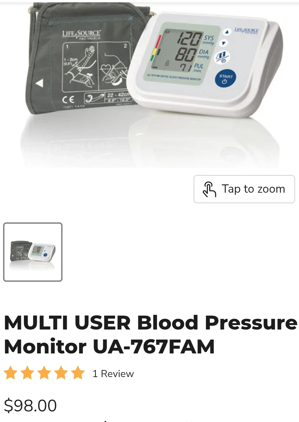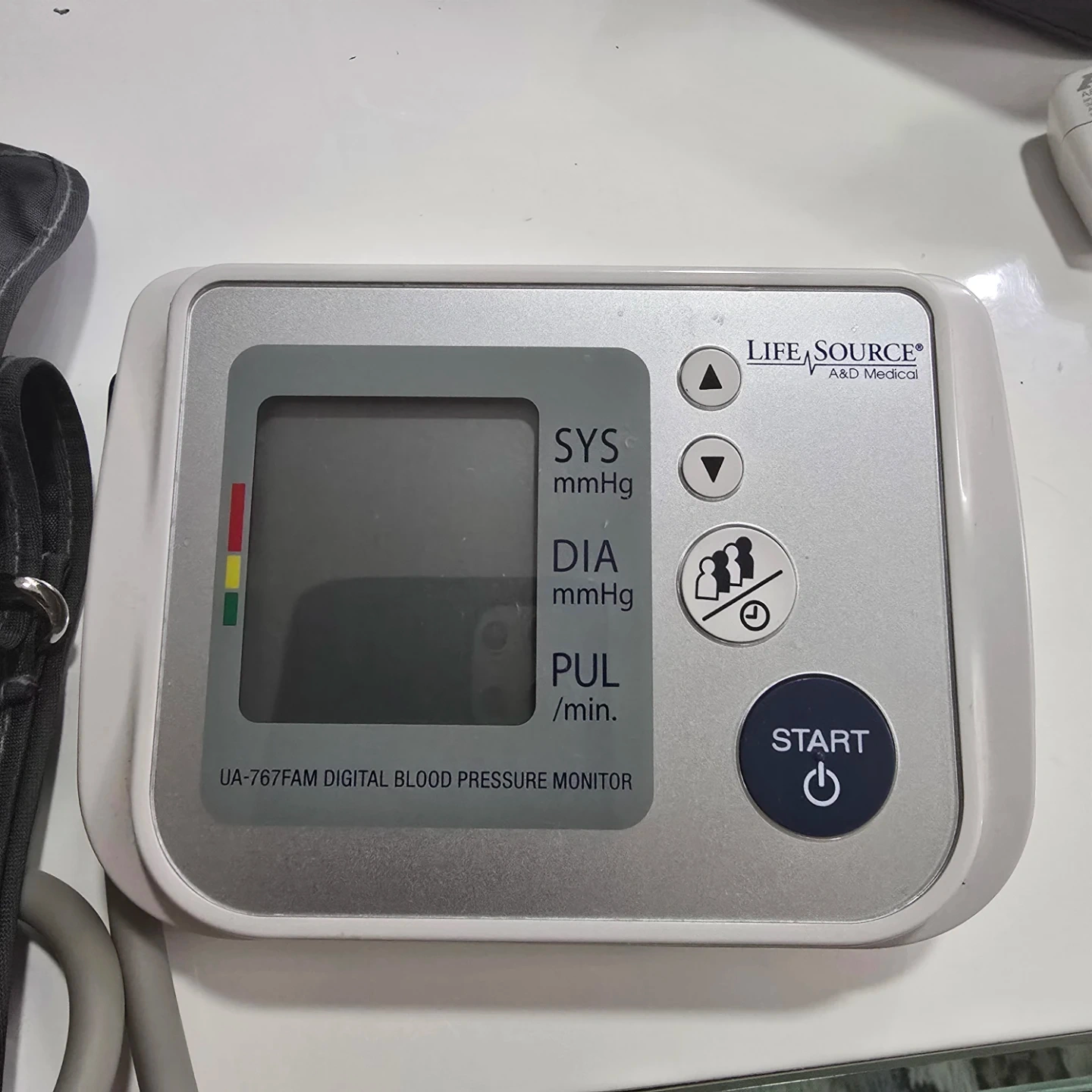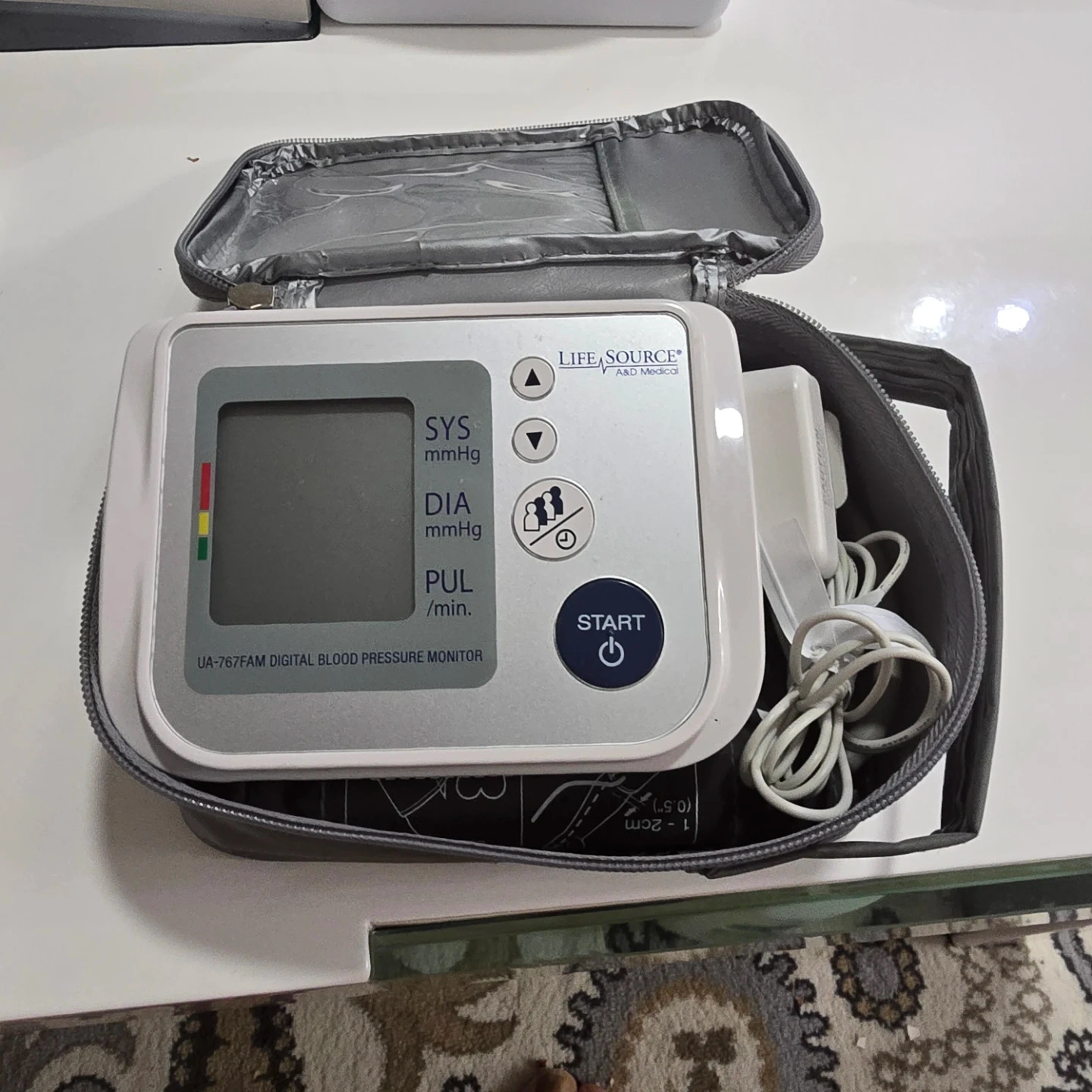 This is a Life Source digital blood pressure monitor, model UA-767FAM. It's a medical device for home use. It comes with an arm cuff that fits arm circumferences of 22-42cm (8.6"-16.5"). Includes the instruction manual and a travel bag.